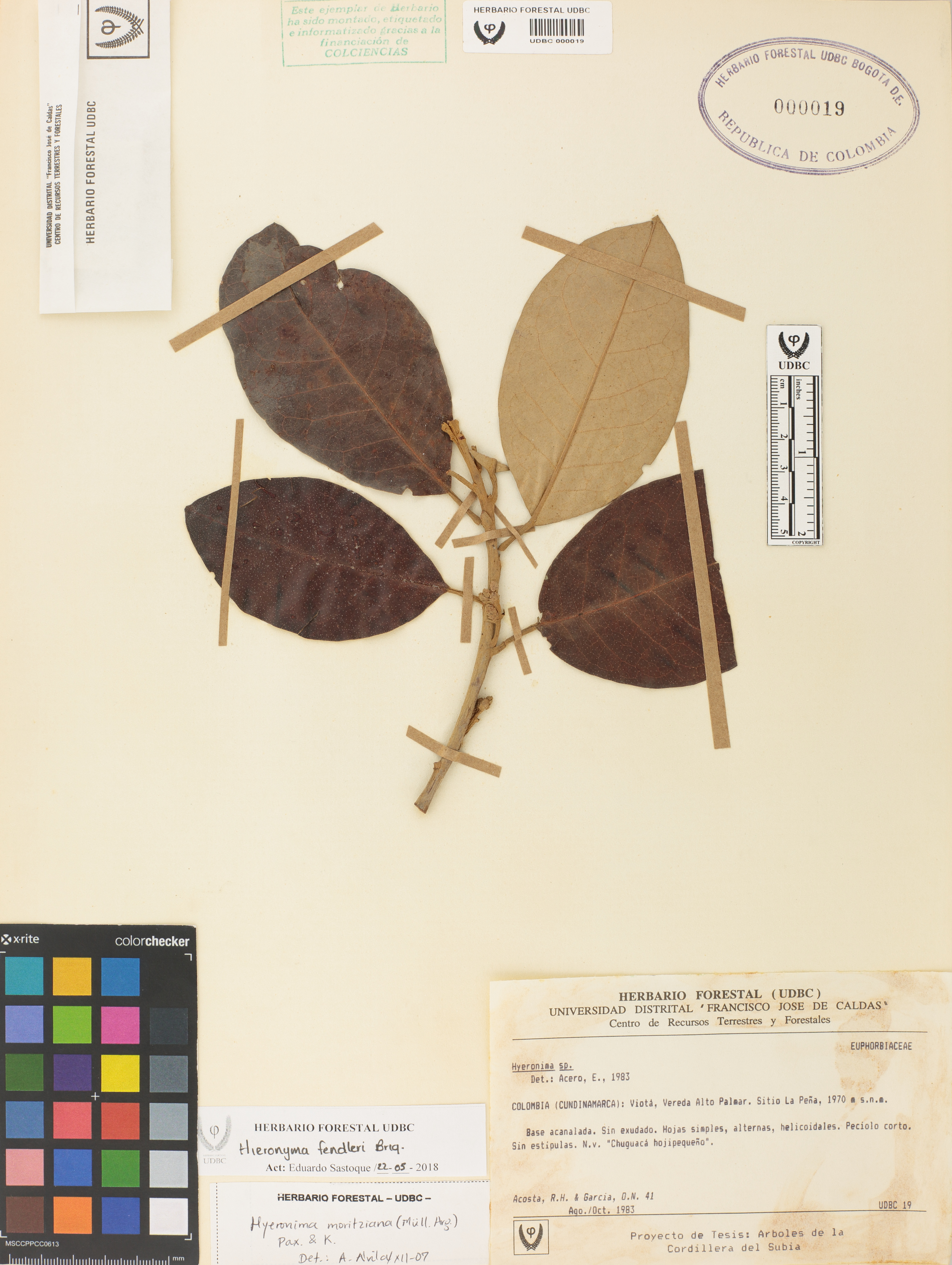 Fotografía del ejemplar Acosta, R. 41, determinado como Hieronyma fendleri en el año 1983