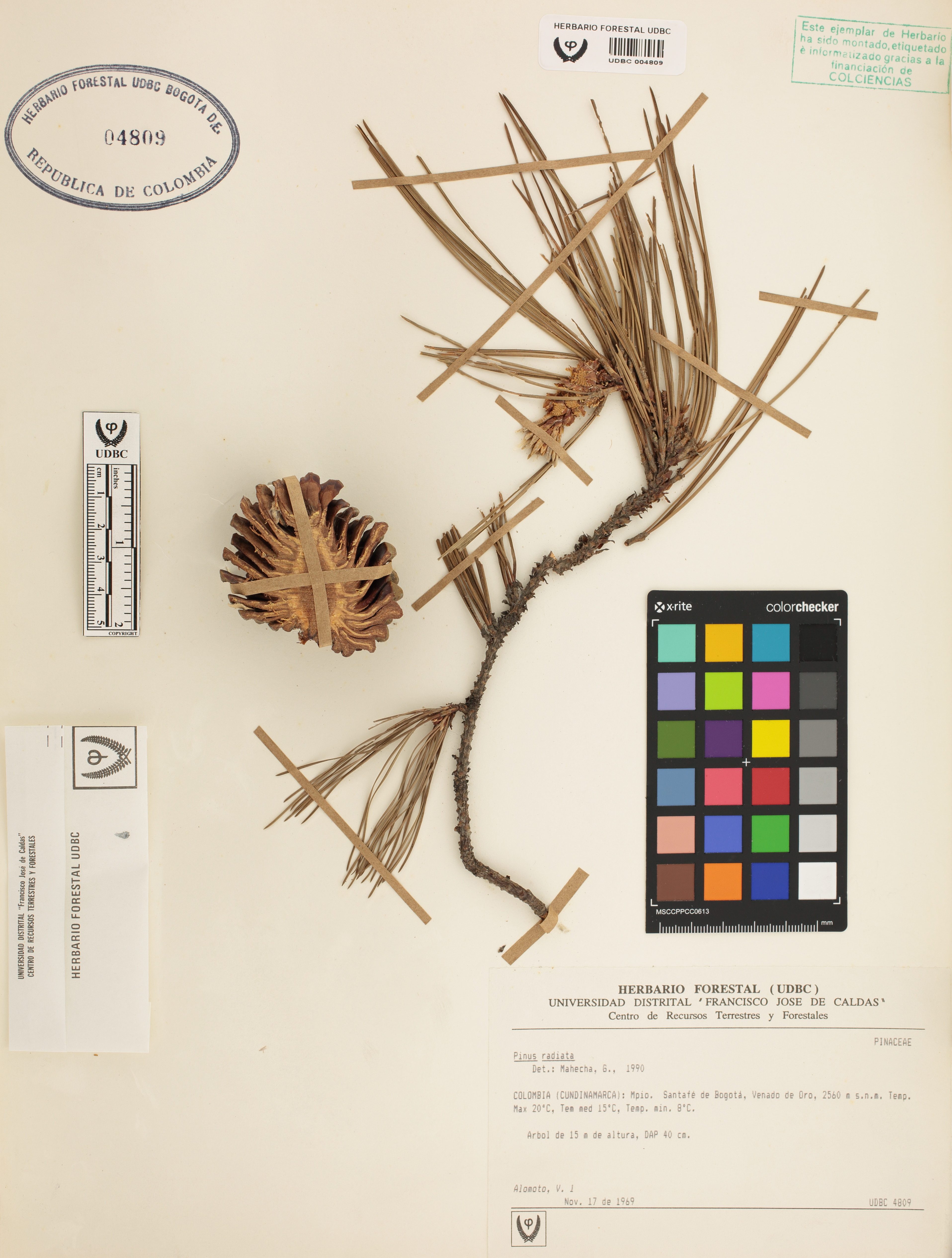 Fotografía del ejemplar Alomoto, V. 1, determinado como Pinus radiata en el año 1990