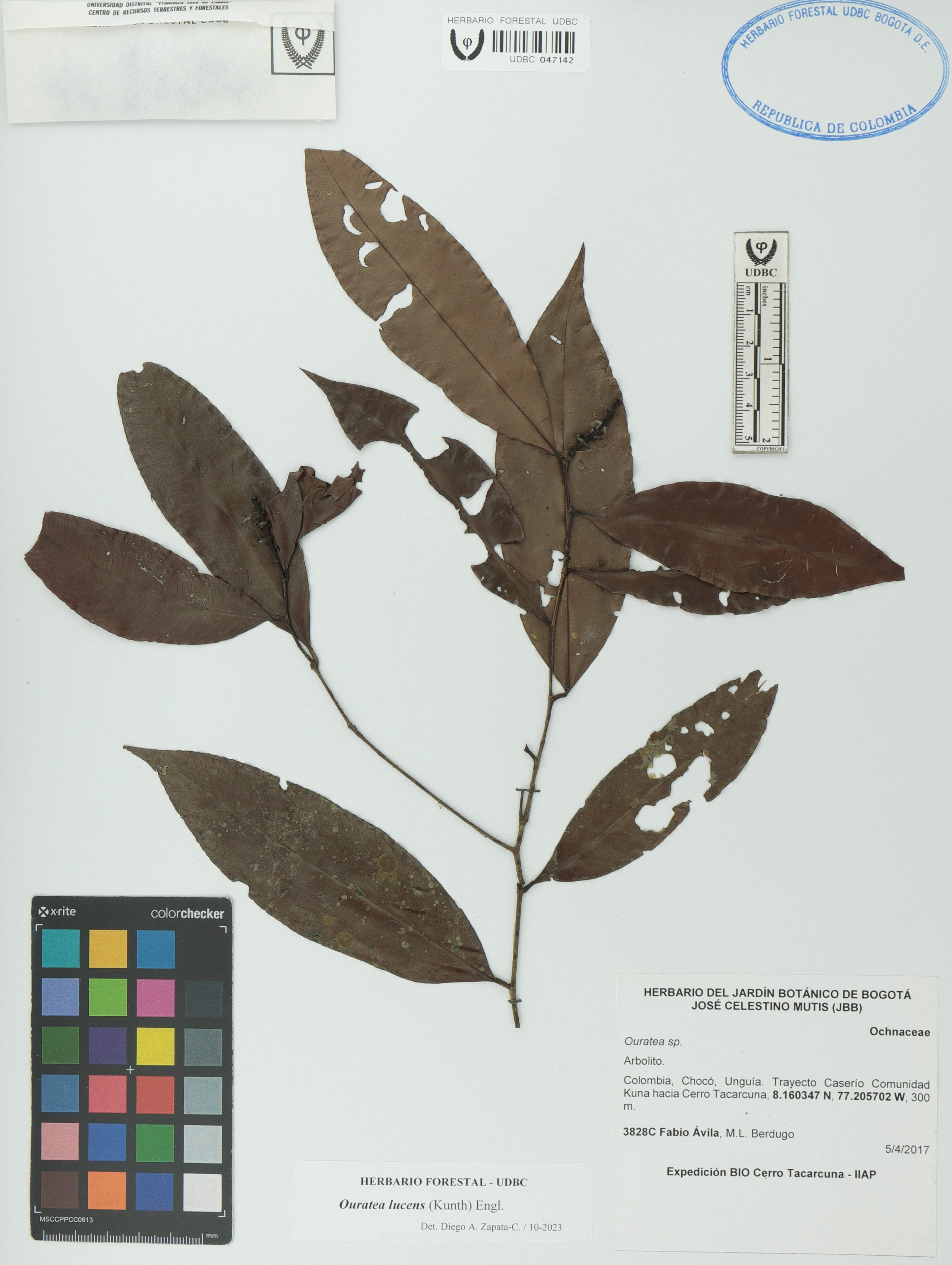 Fotografía del ejemplar Ávila, F. 3828C, determinado como Ouratea lucens en el año 2023