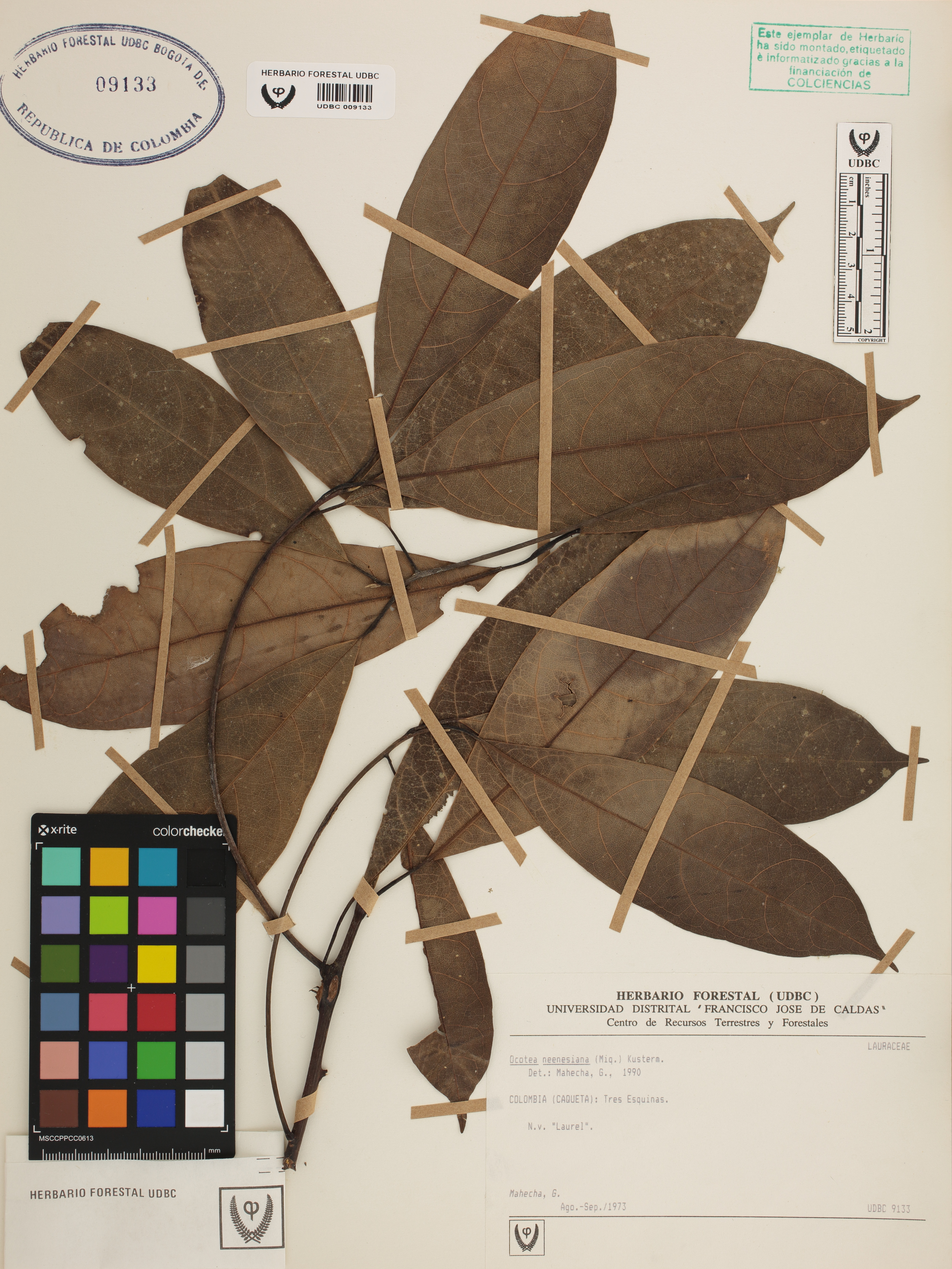Fotografía del ejemplar Mahecha, G., determinado como Ocotea neesiana en el año 1990
