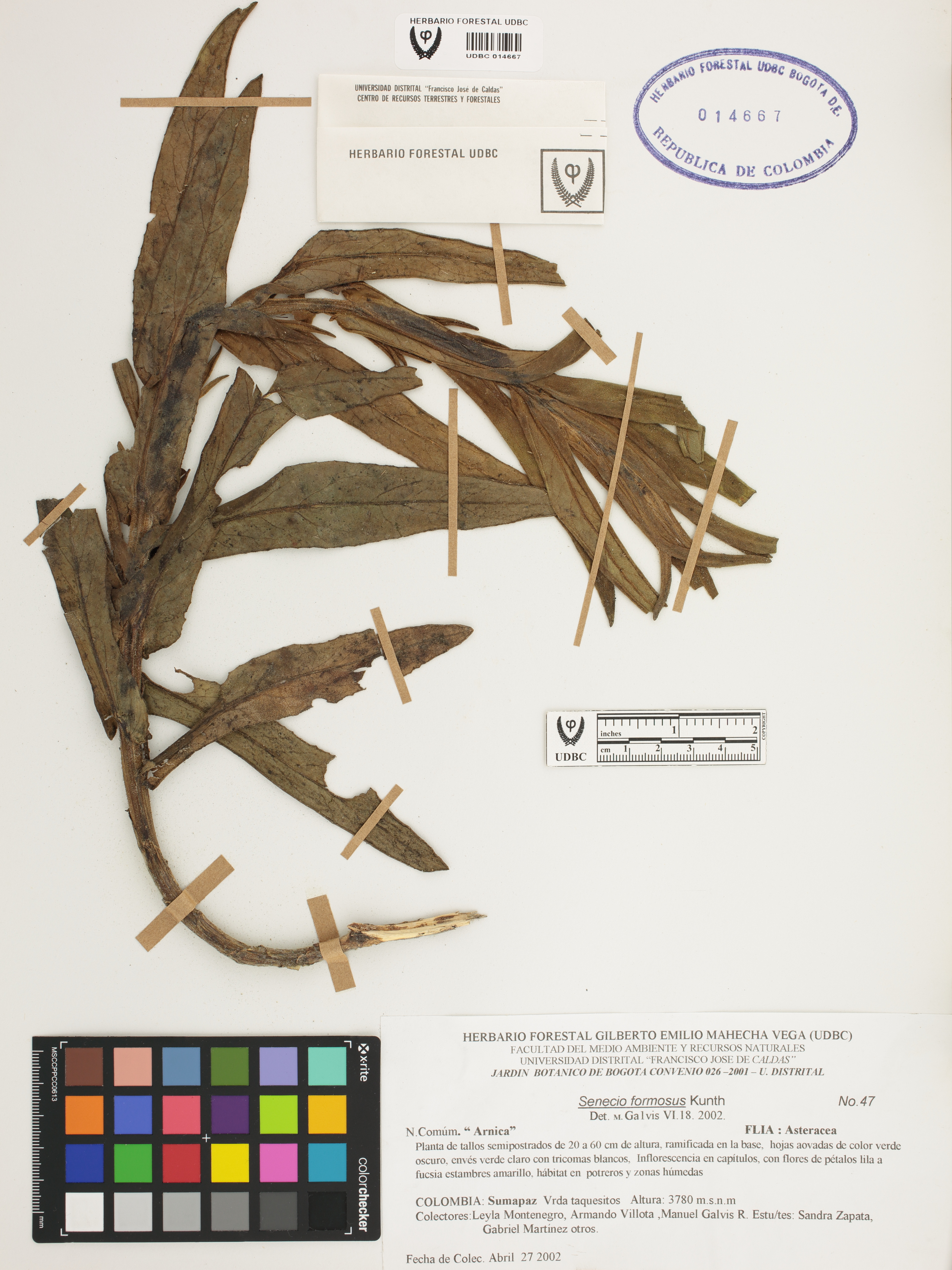 Fotografía del ejemplar Montenegro, L. 47, determinado como Senecio formosus en el año 2002