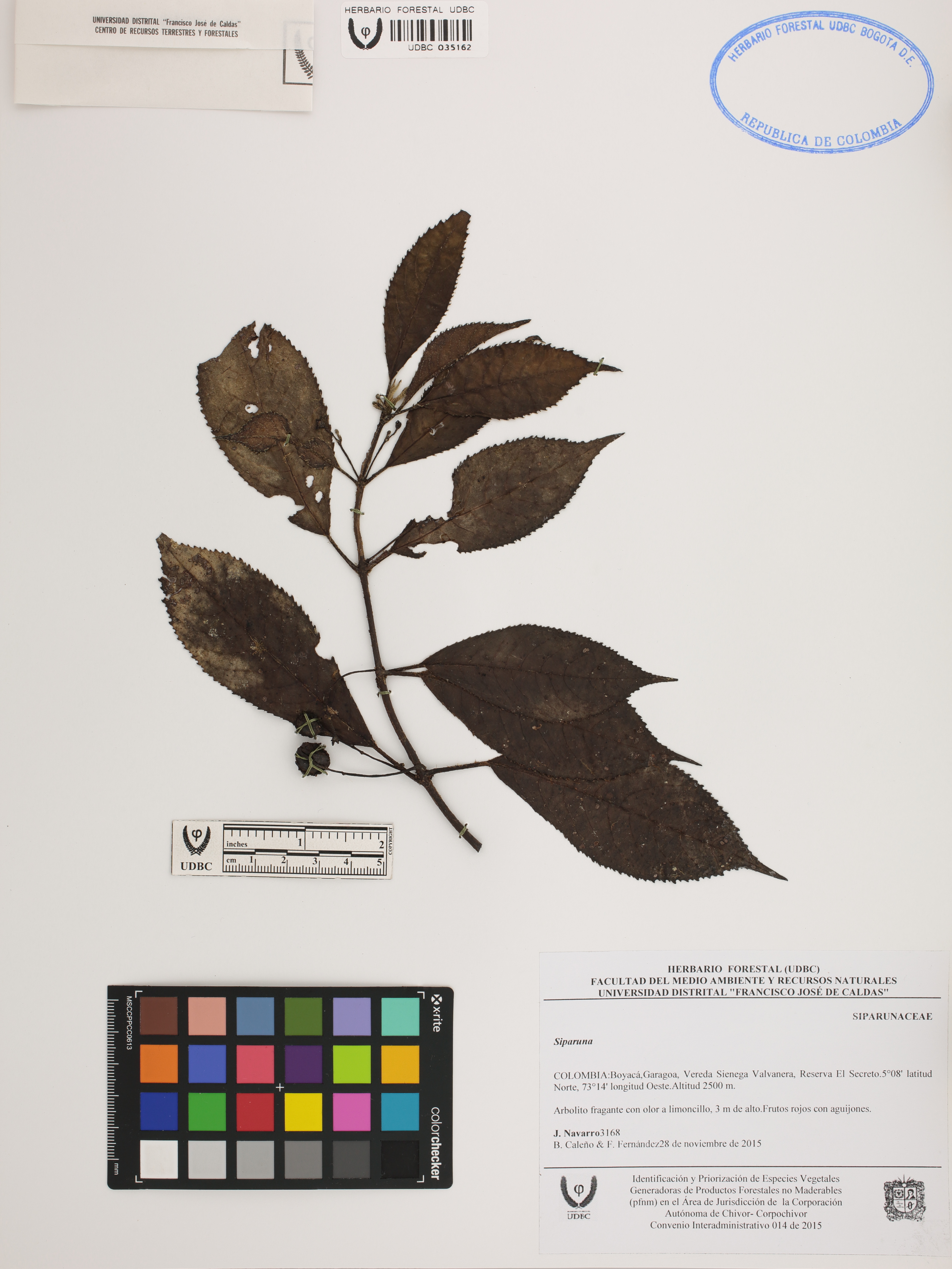 Fotografía del ejemplar Navarro, J. 3168, determinado como Siparuna sp.