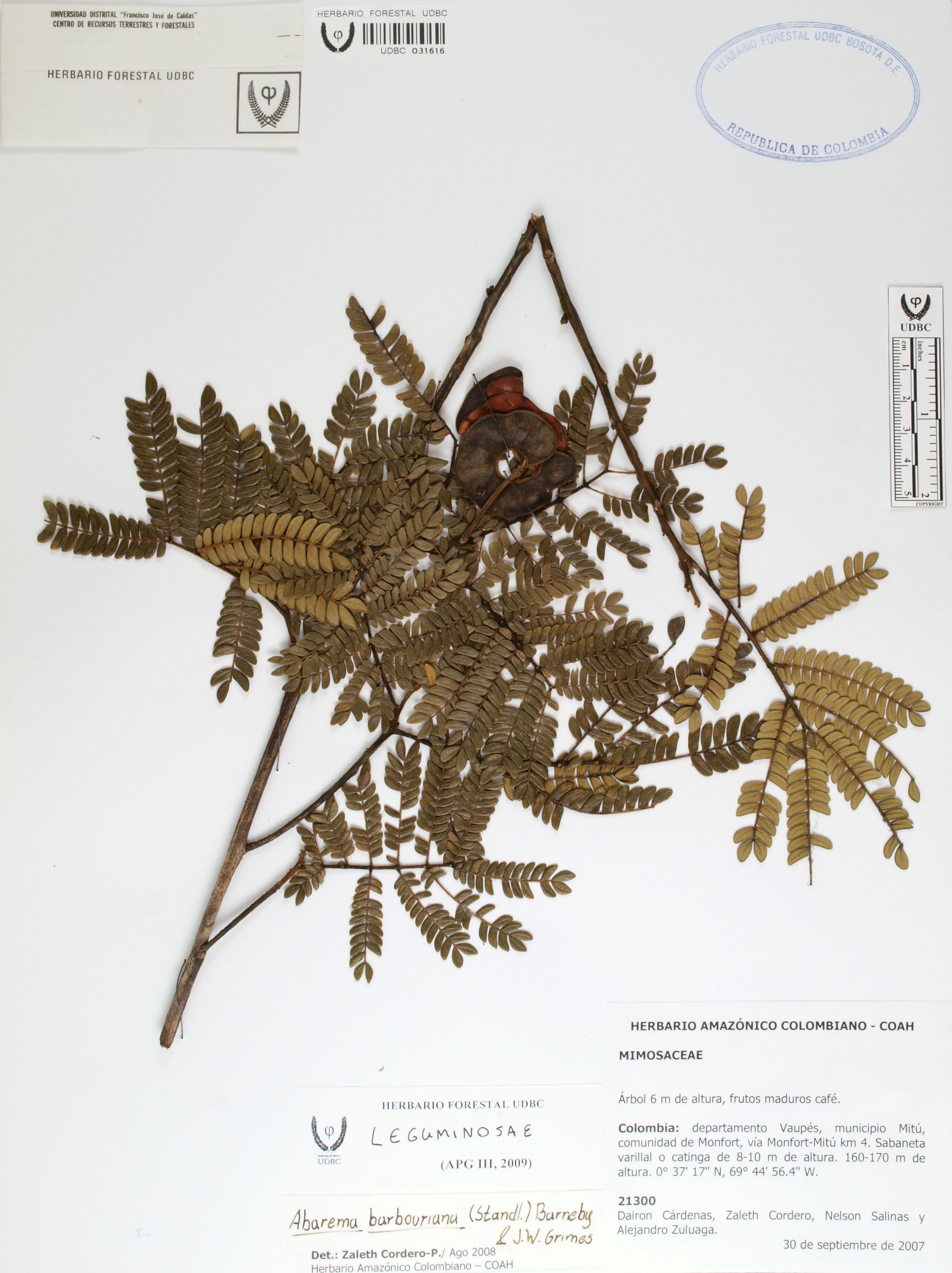Fotografía del ejemplar Cárdenas, D. 21300, determinado como Abarema barbouriana en el año 2008