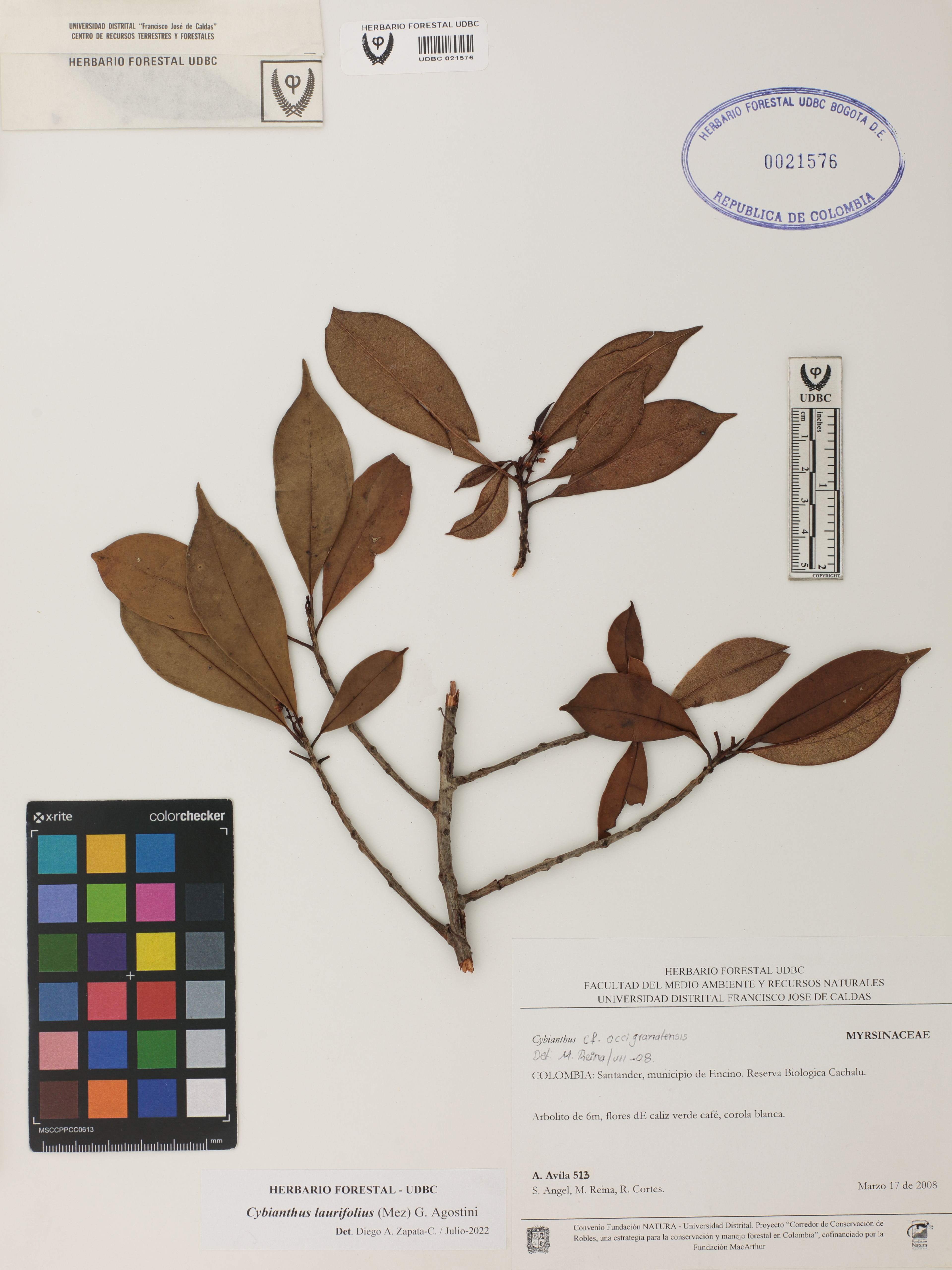 Fotografía del ejemplar Ávila, F. 513, determinado como Cybianthus laurifolius en el año 2022