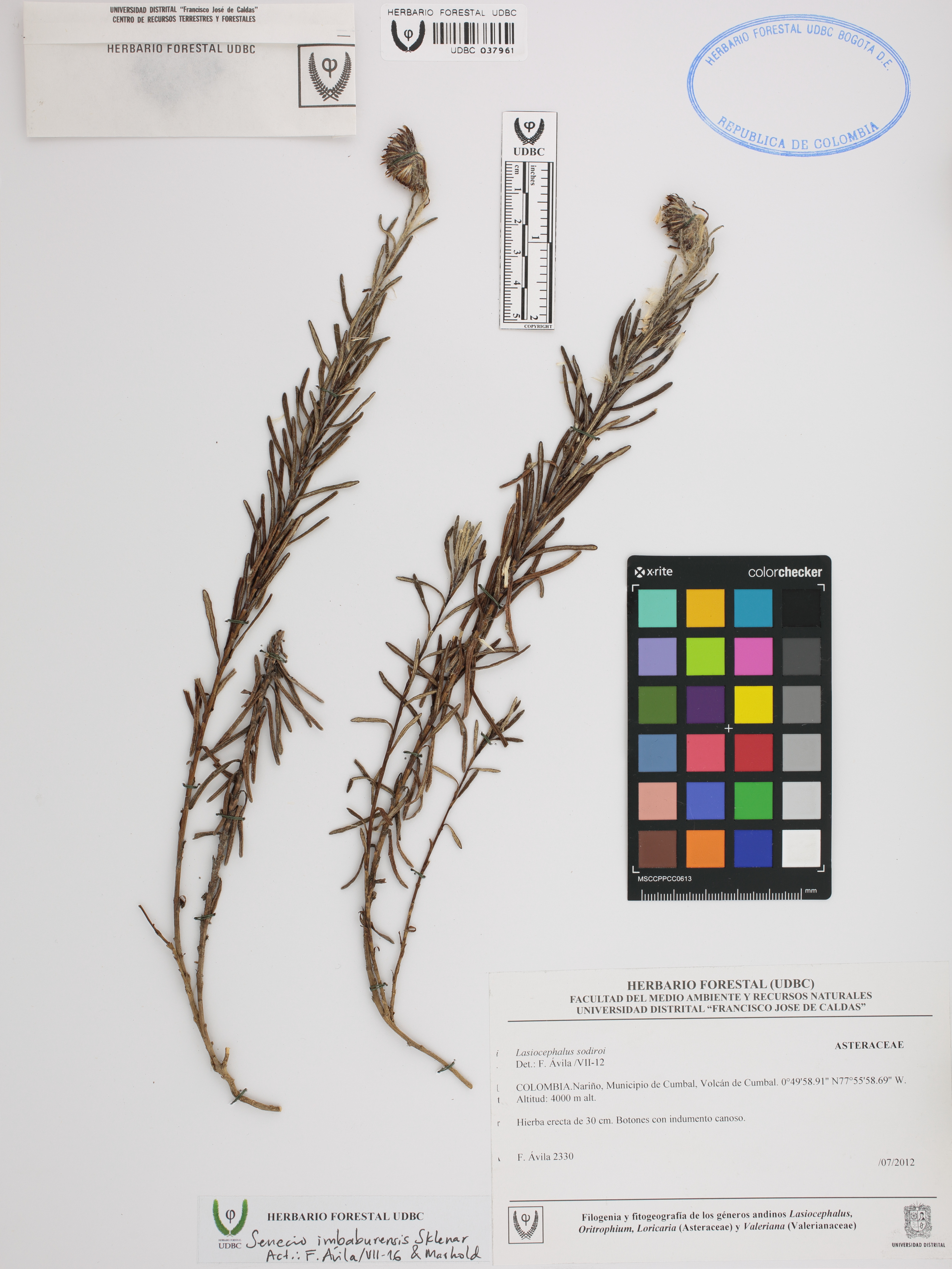 Fotografía del ejemplar Ávila, F. 2330, determinado como Senecio imbaburensis en el año 2016