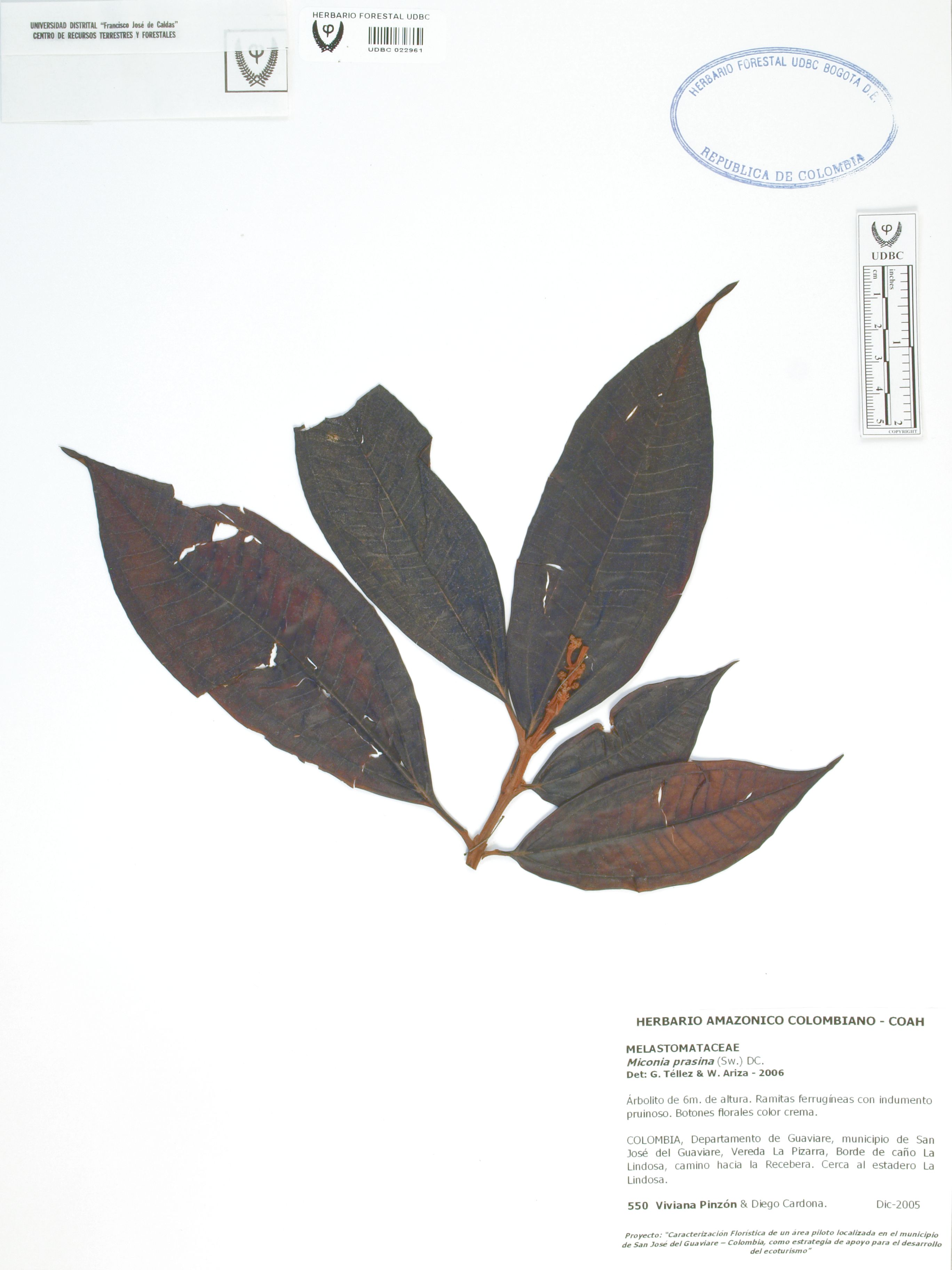 Fotografía del ejemplar Pinzón, V. 550, determinado como Miconia prasina en el año 2006