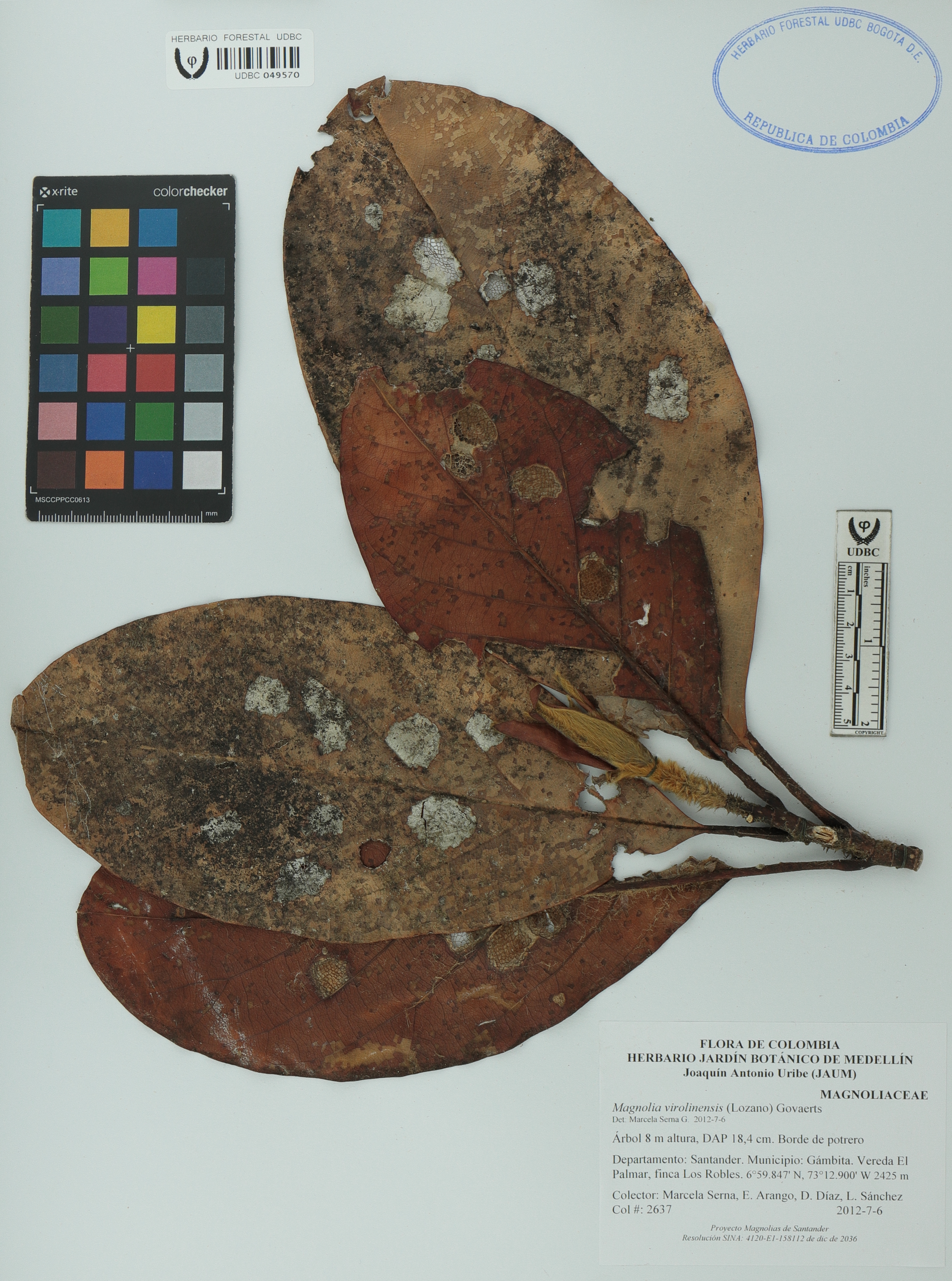 Fotografía del ejemplar Serna, M. 2637, determinado como Magnolia virolinensis en el año 2012