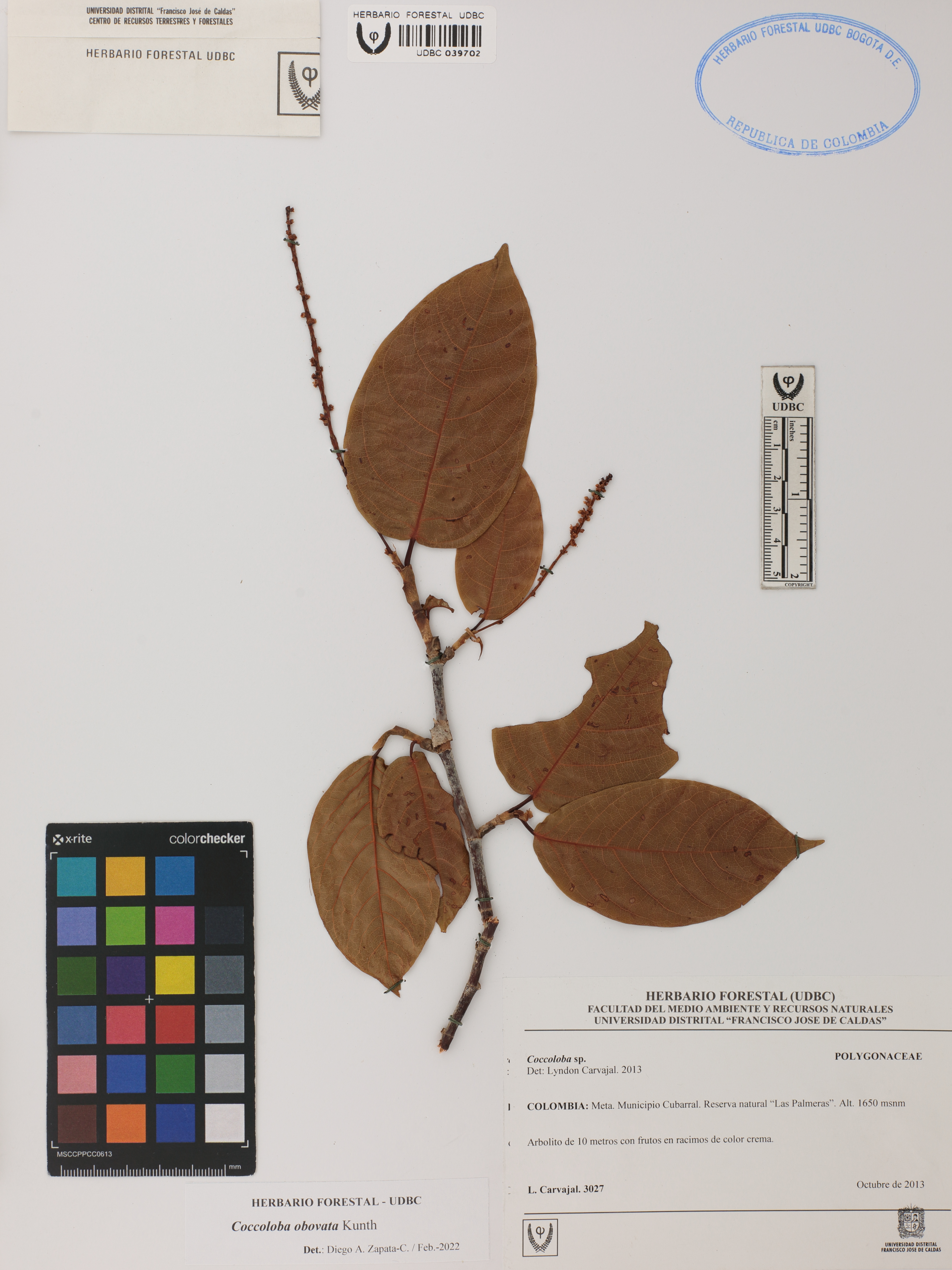 | dc.description | Fotografía del ejemplar Carvajal, L. 3027, determinado como Coccoloba obovata en el año 2022 | |