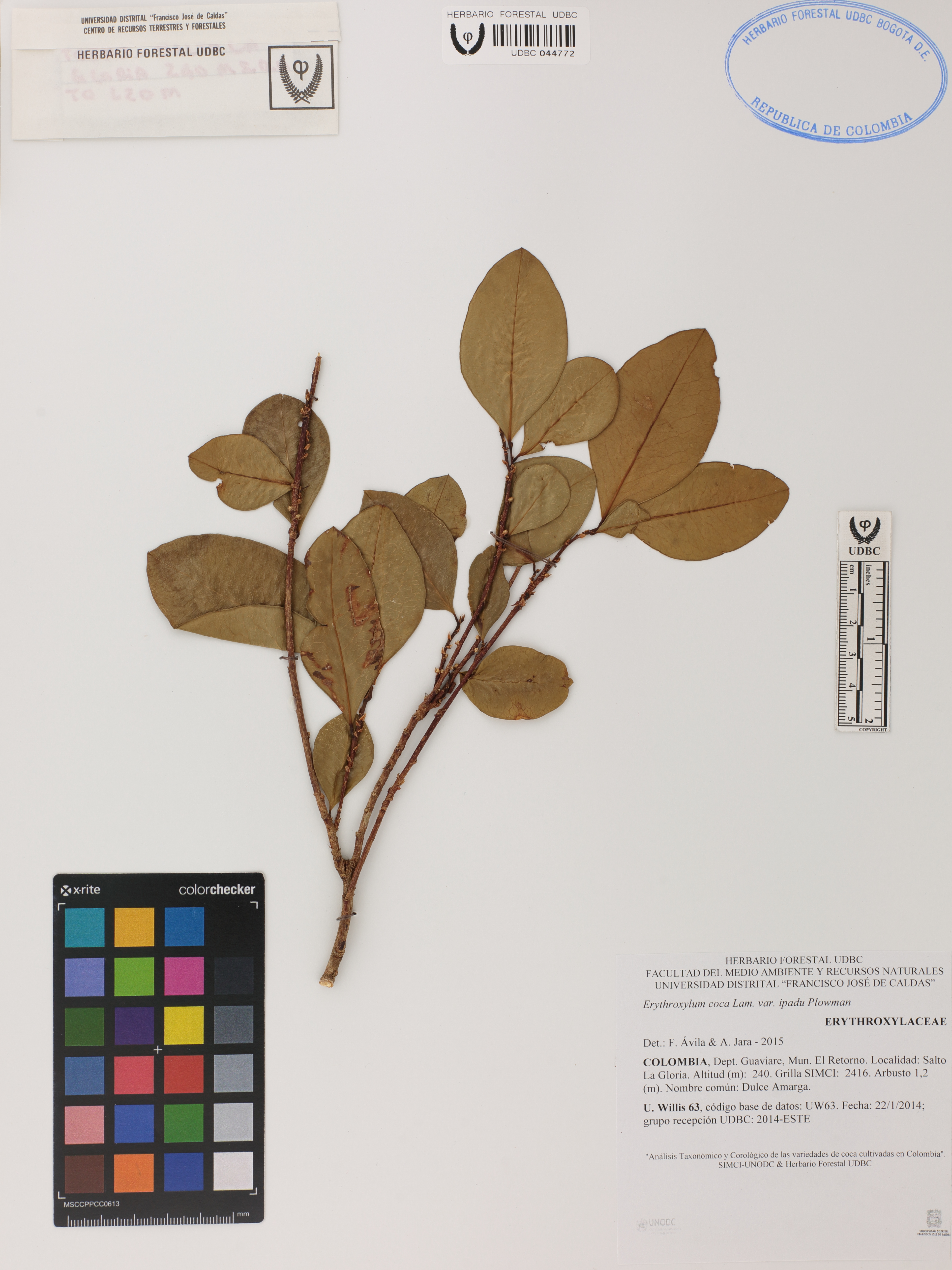 Fotografía del ejemplar Willis, U. 63, determinado como Erythroxylum coca var. ipadu en el año 2015