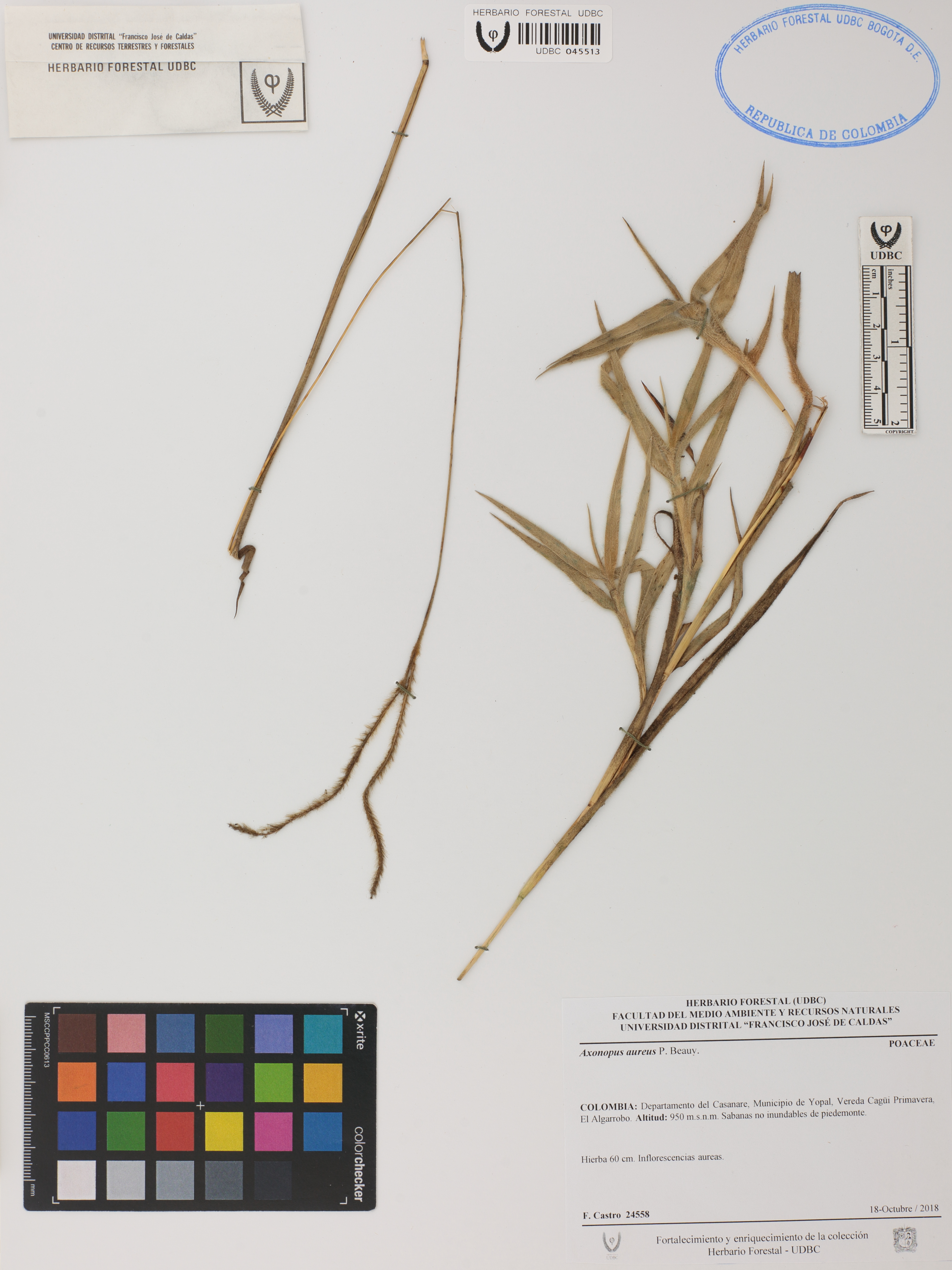 Fotografía del ejemplar Castro, F. 24558, determinado como Axonopus aureus en el año 2018