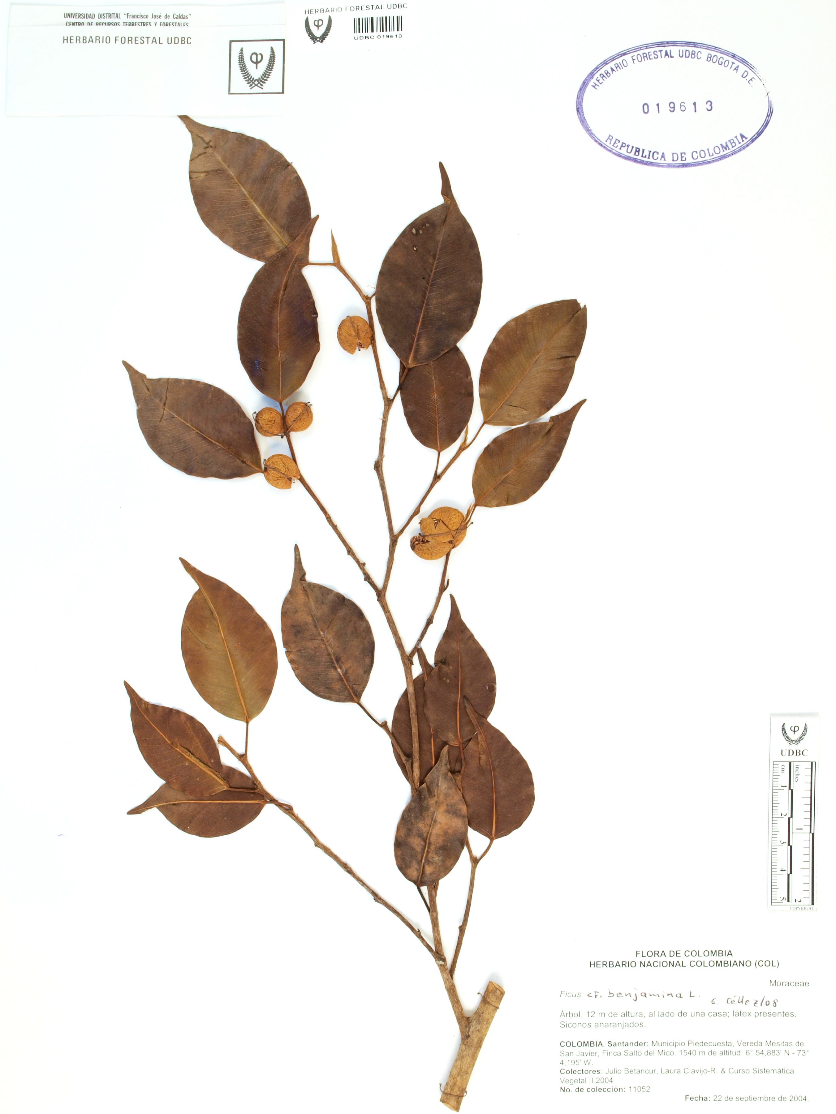Fotografía del ejemplar Betancur, J. 11052, determinado como Ficus benjamina en el año 2008