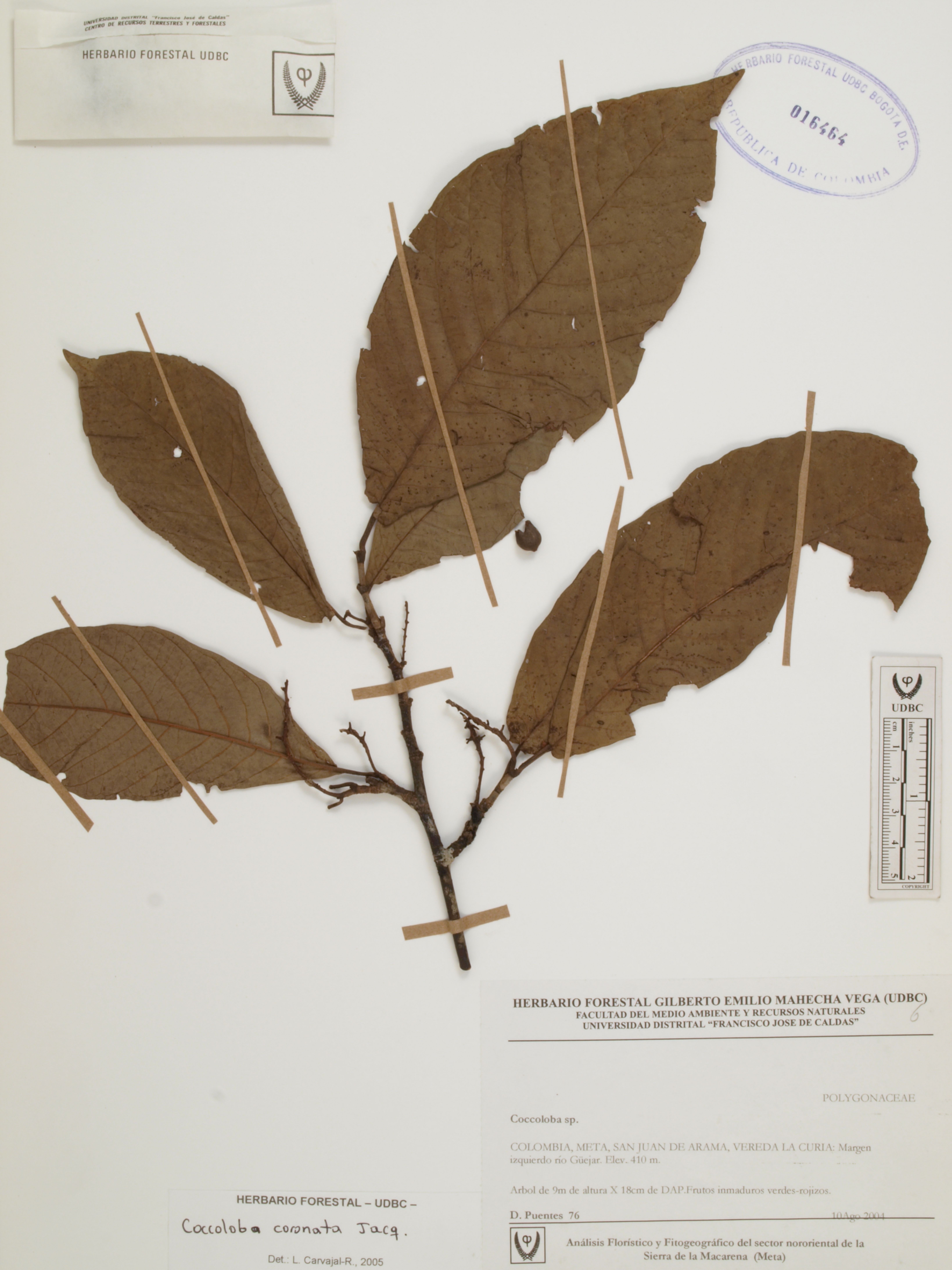 Fotografía del ejemplar Puentes, D. 76, determinado como Coccoloba coronata en el año 2005
