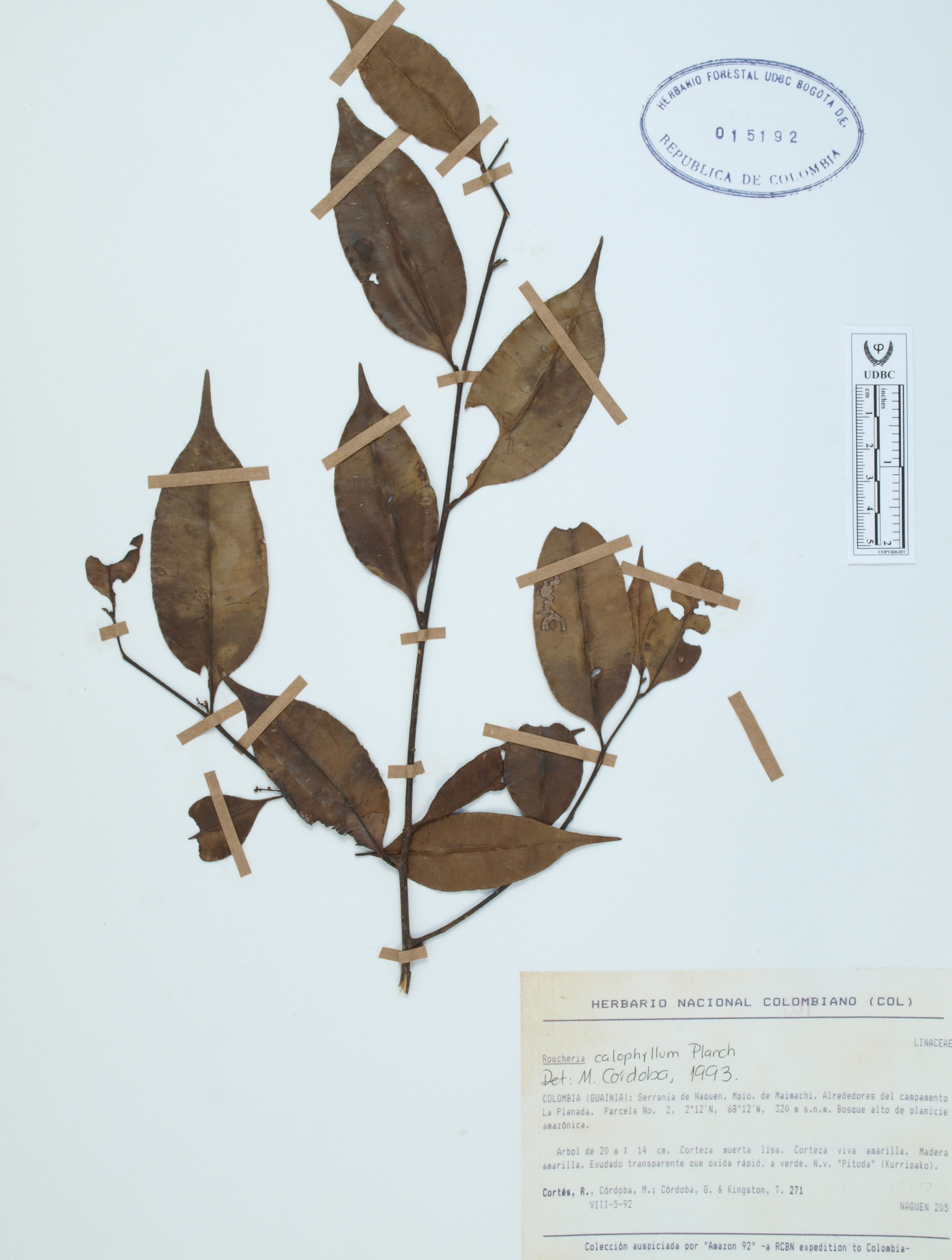 Fotografía del ejemplar Cortés-B., R. 271, determinado como Roucheria calophylla en el año 1993