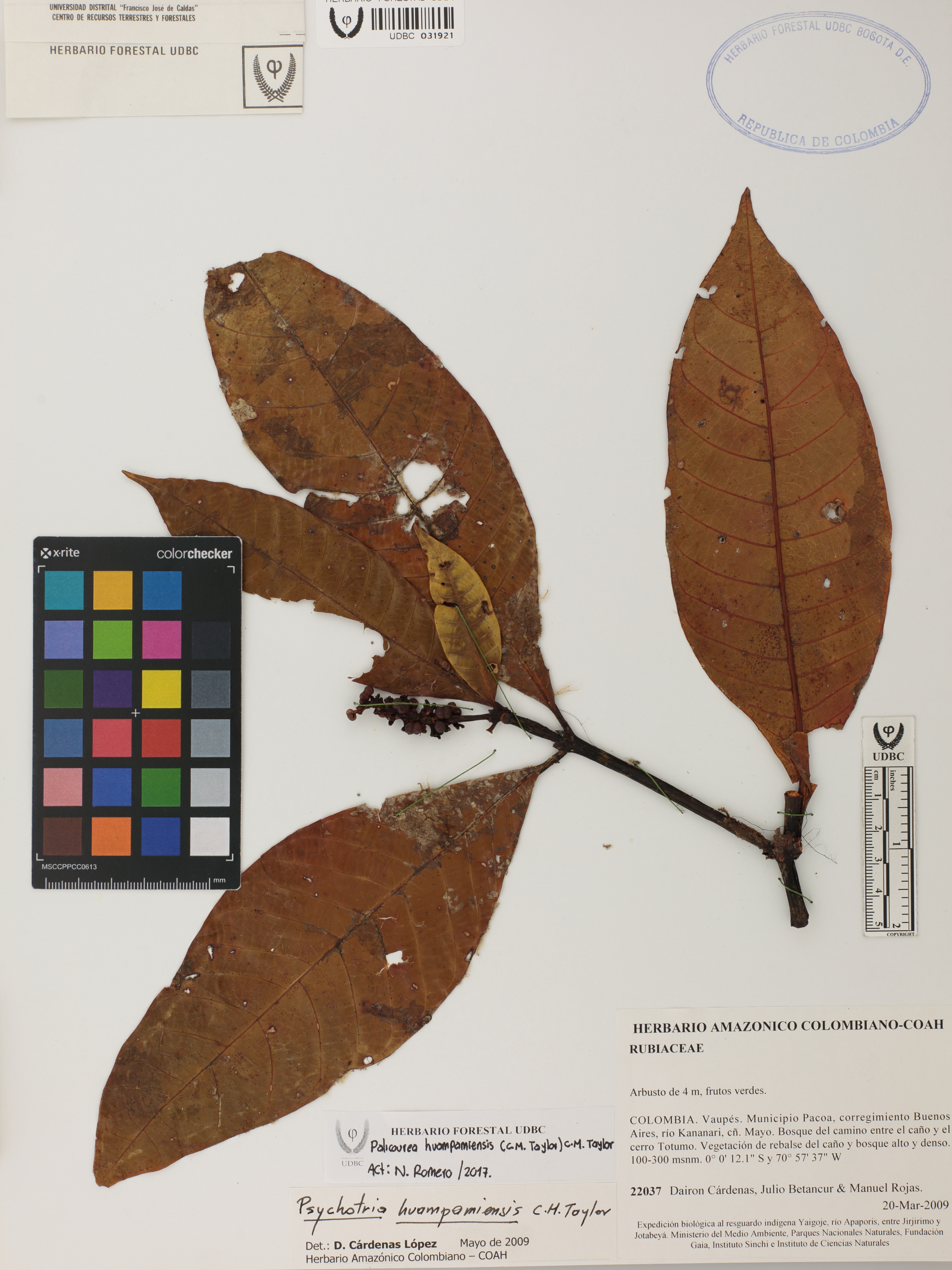 Fotografía del ejemplar Cárdenas, D. 22037, determinado como Palicourea huampamiensis en el año 2009