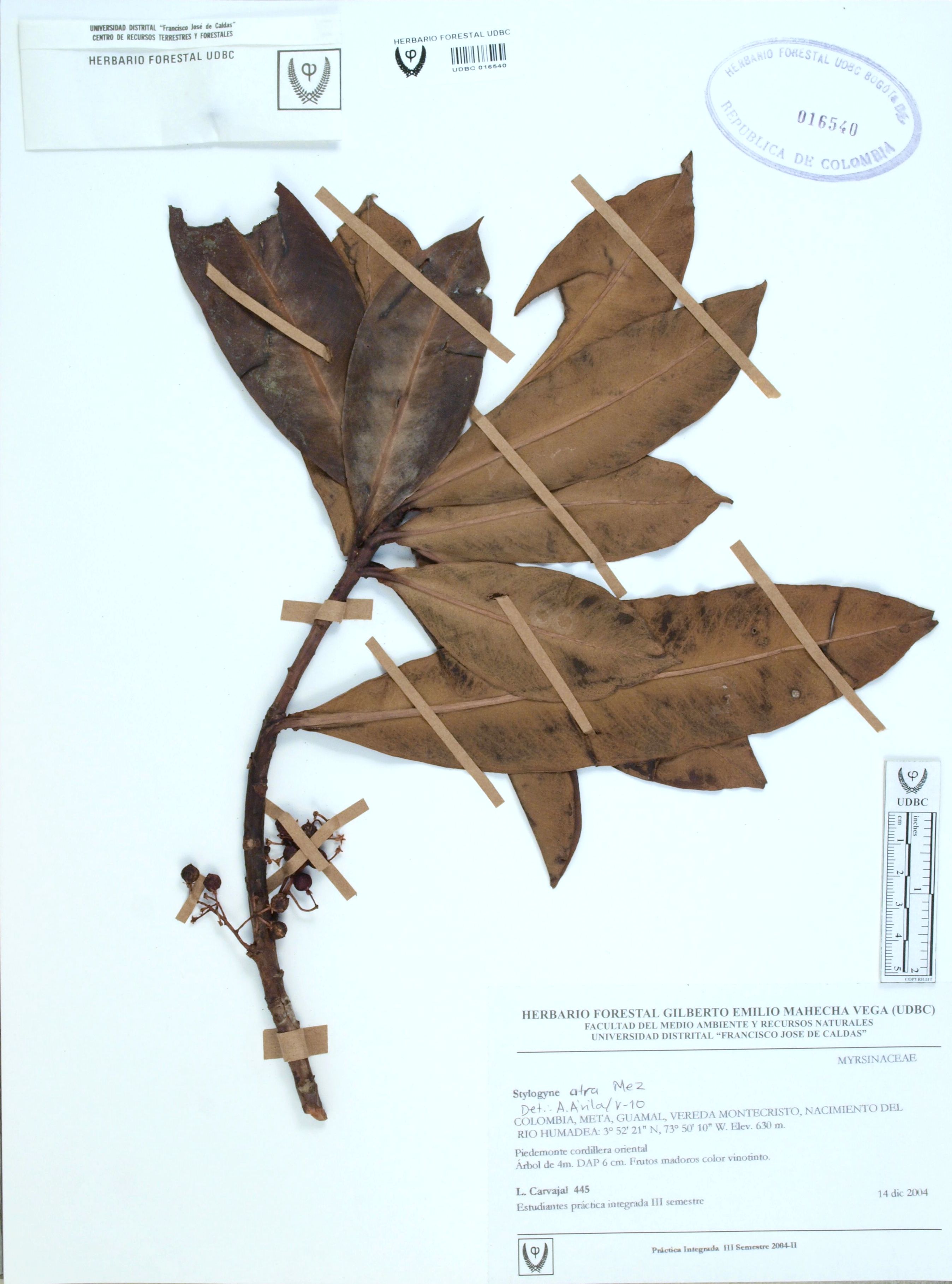 Fotografía del ejemplar Carvajal, L. 445, determinado como Stylogyne atra en el año 2010