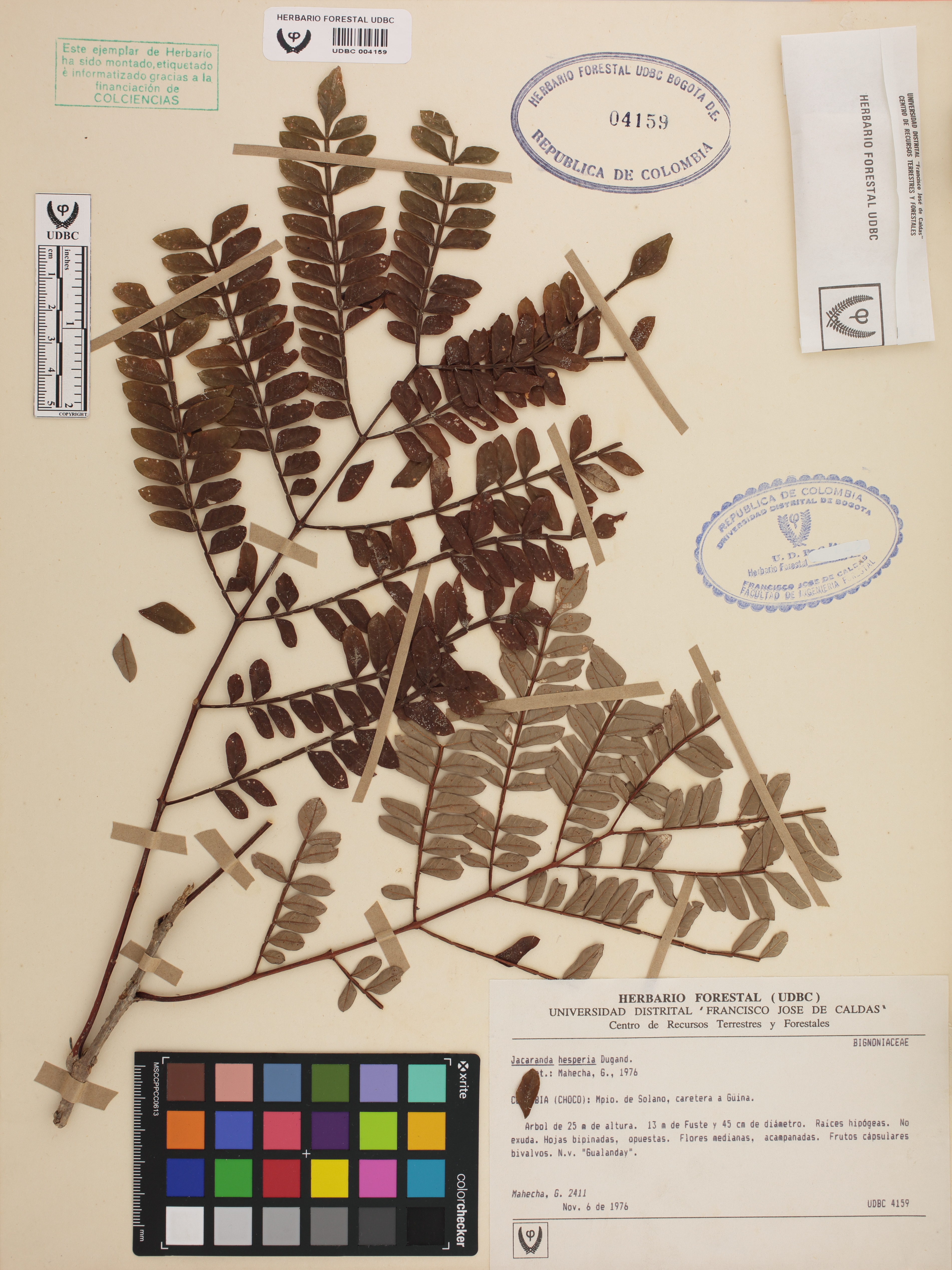 Fotografía del ejemplar Mahecha, G. 2411, determinado como Jacaranda hesperia en el año 1976