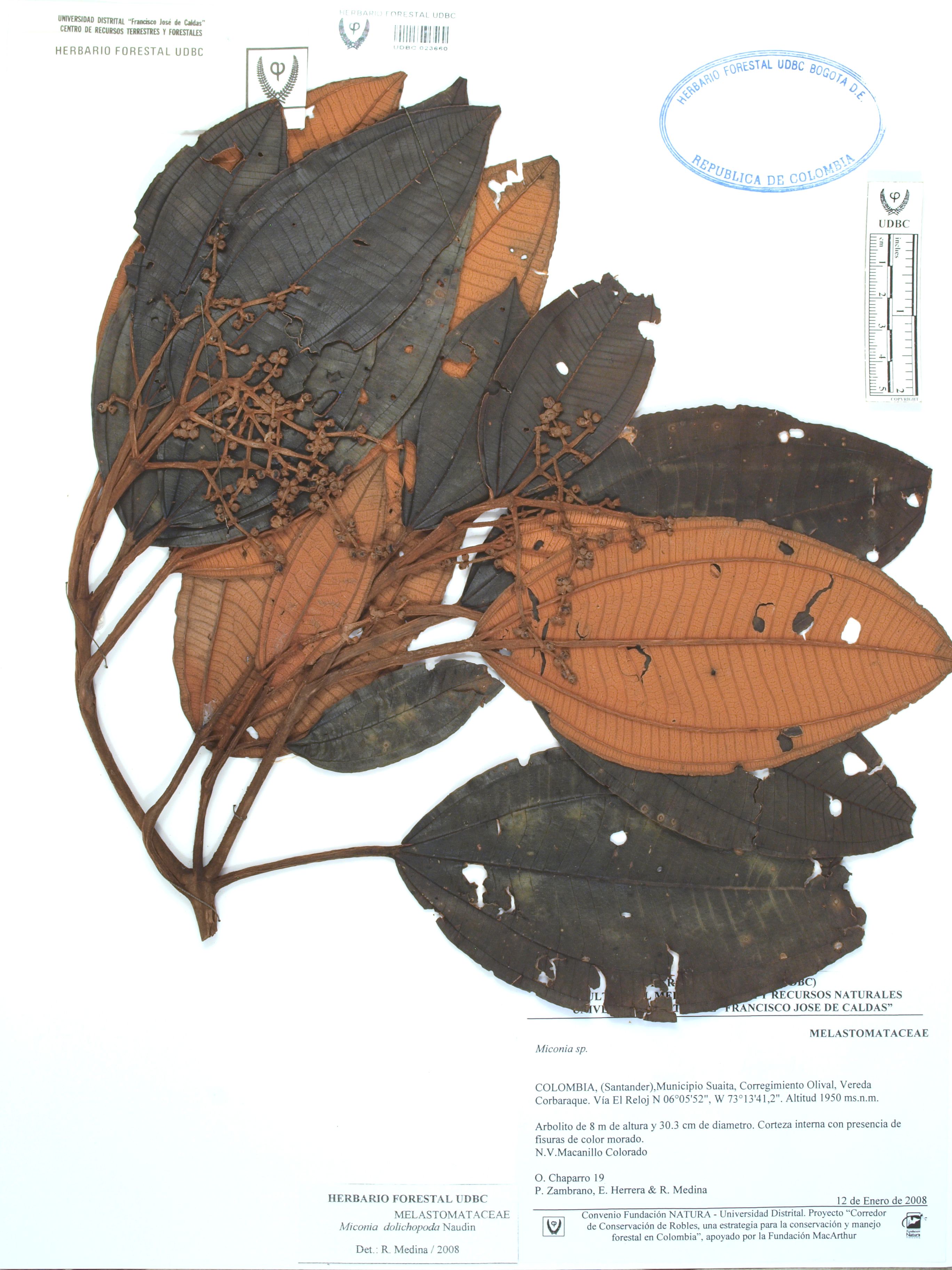 Fotografía del ejemplar Chaparro, O. 19, determinado como Miconia dolichopoda en el año 2008