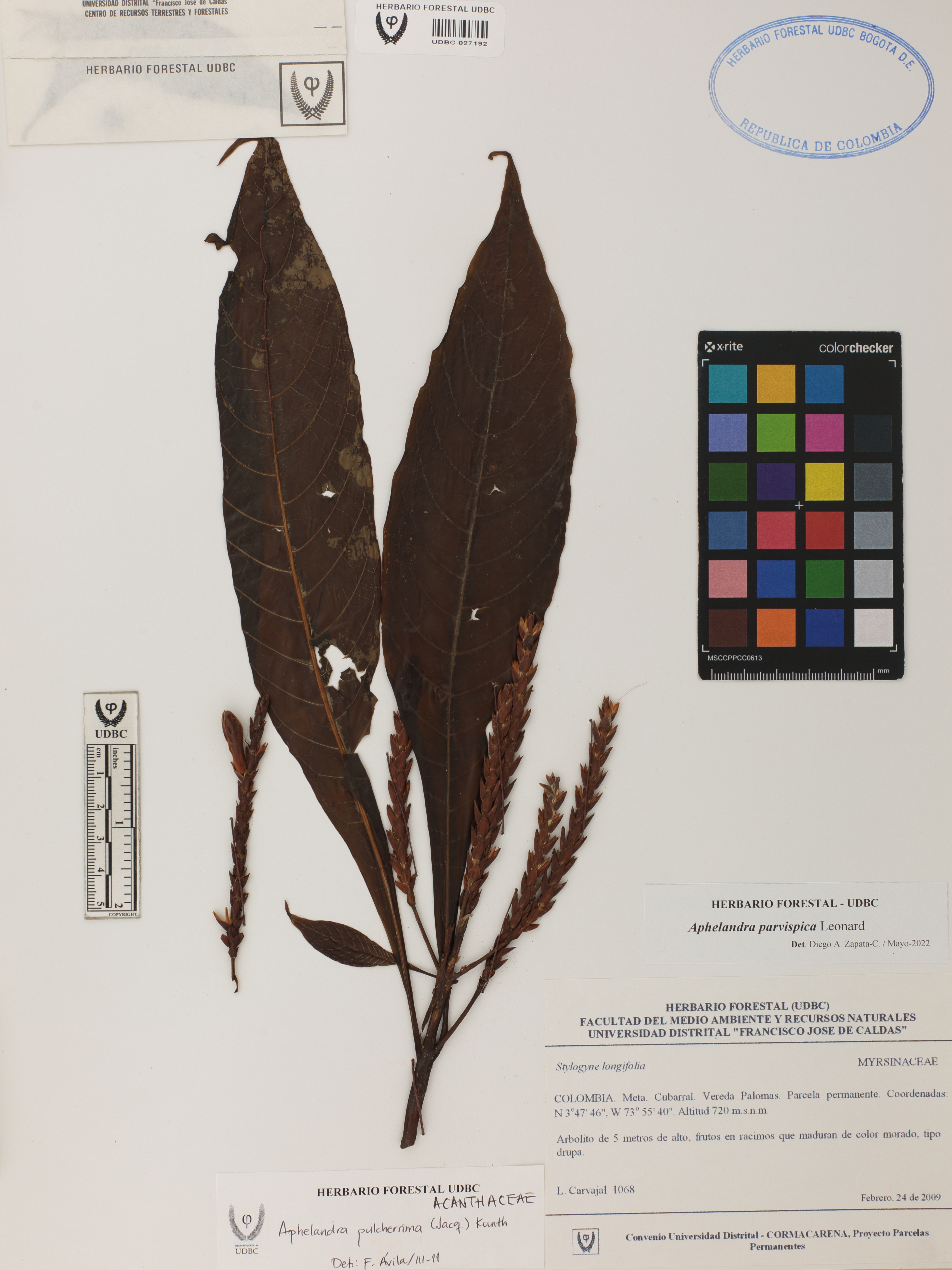 Fotografía del ejemplar Carvajal, L. 1068, determinado como Aphelandra parvispica en el año 2022