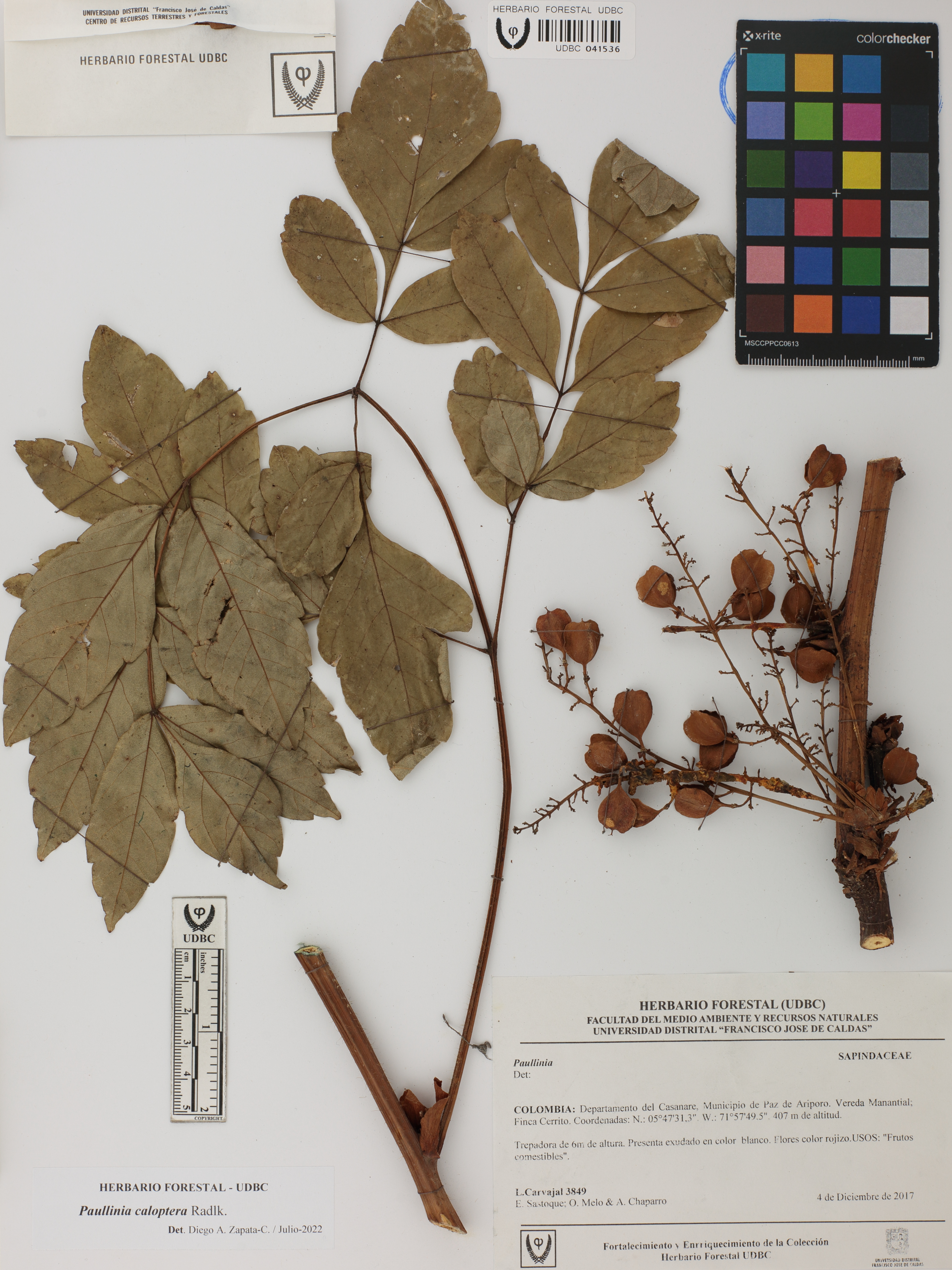 Fotografía del ejemplar Carvajal, L. 3849, determinado como Paullinia caloptera en el año 2022