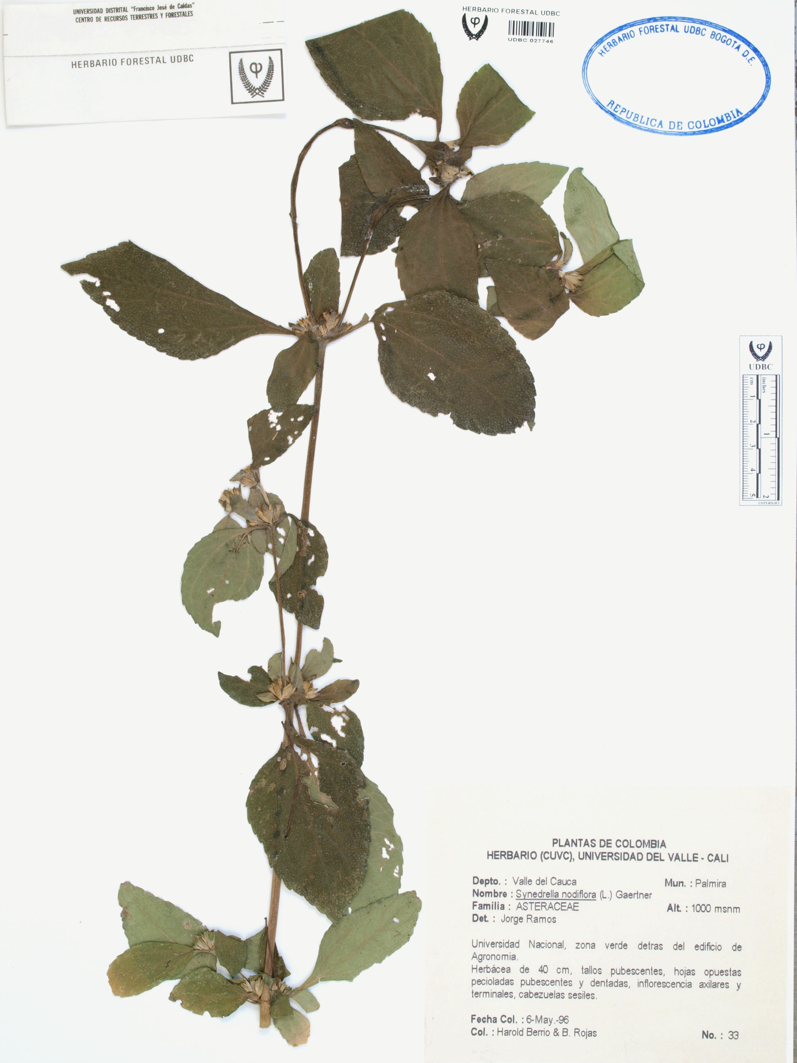 Fotografía del ejemplar Berrío, H. 33, determinado como Synedrella nodiflora