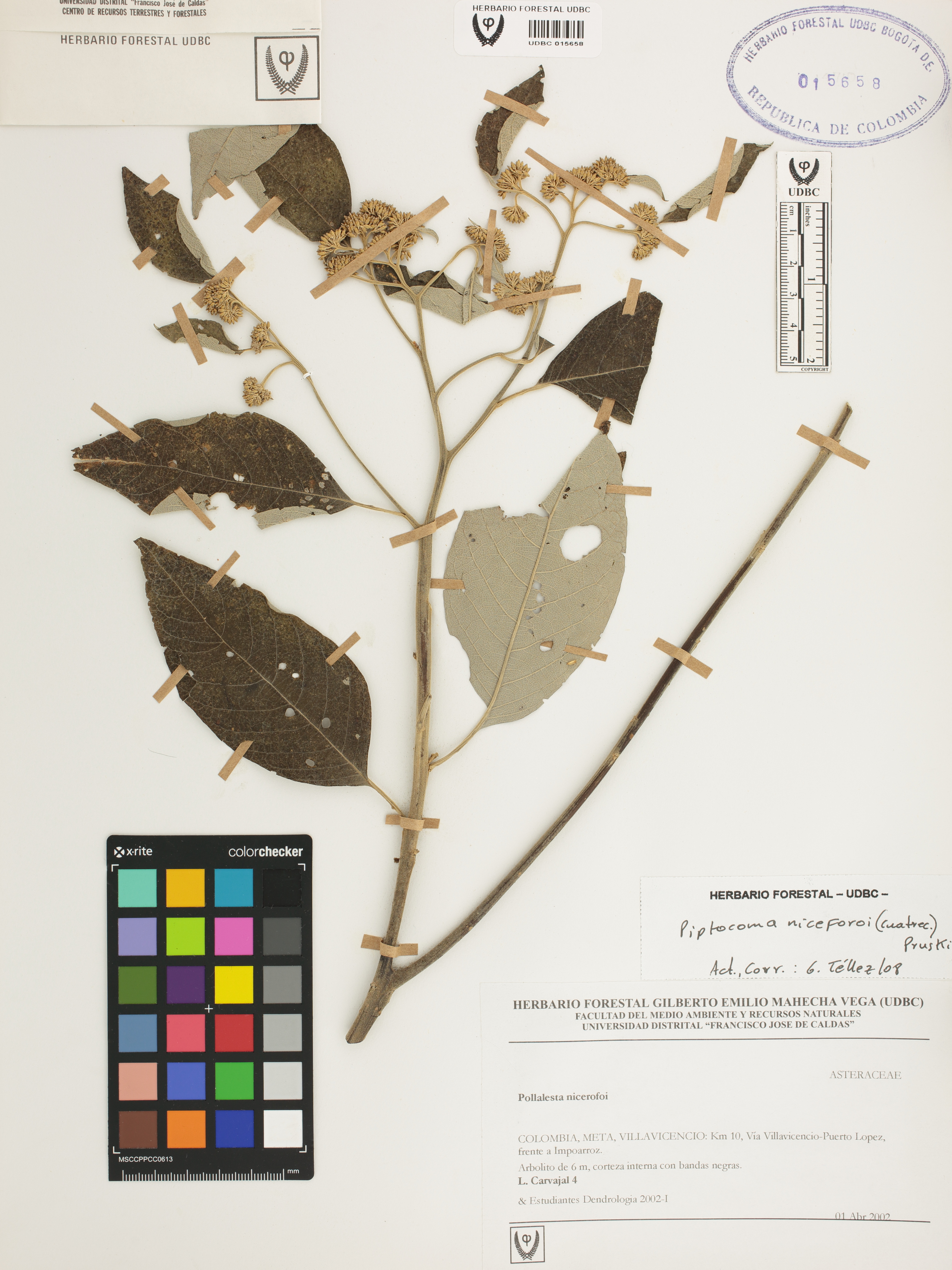 Fotografía del ejemplar Carvajal, L. 4, determinado como Piptocoma niceforoi en el año 2008