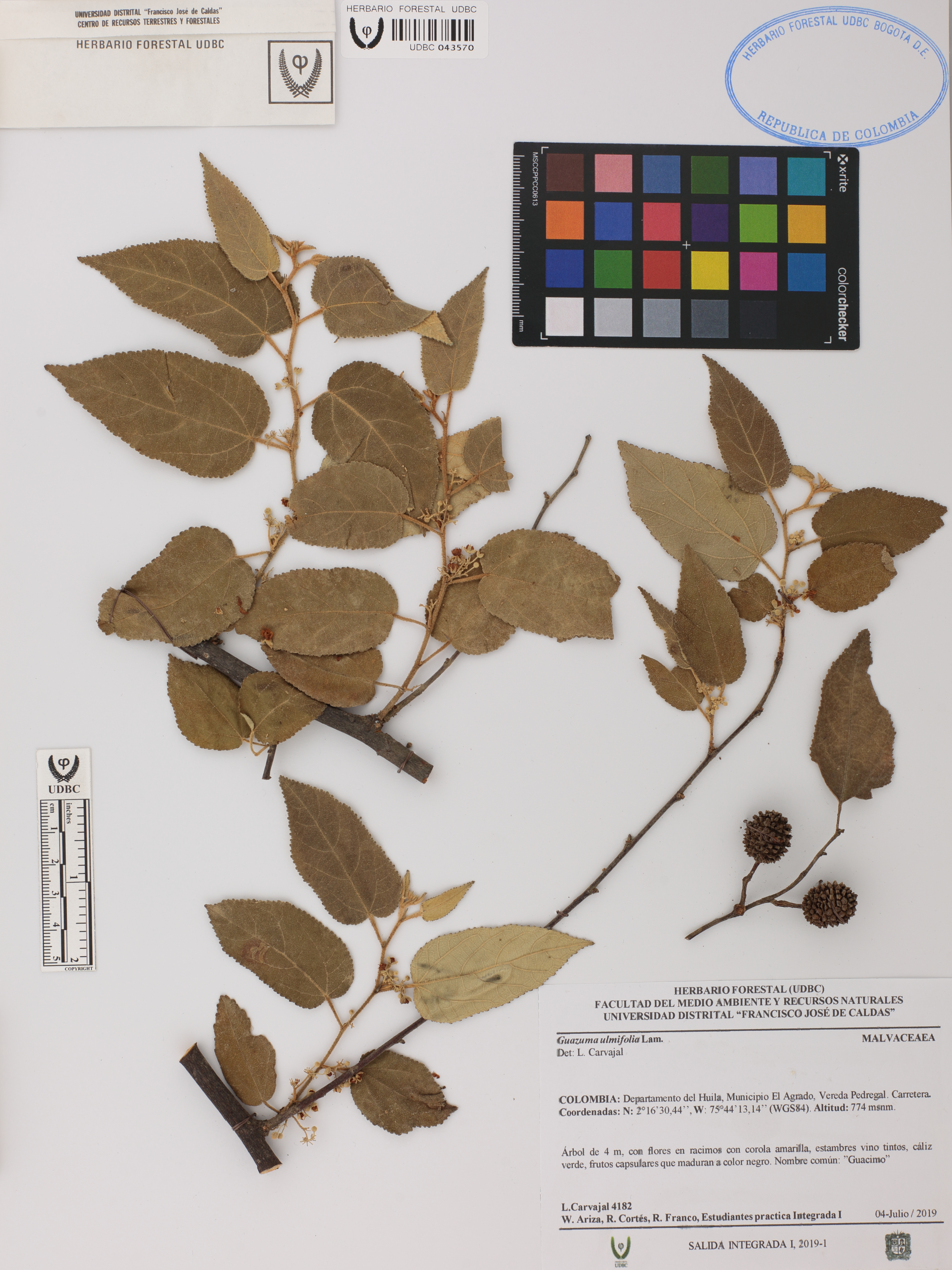 Fotografía del ejemplar Carvajal, L. 4182, determinado como Guazuma ulmifolia en el año 2019