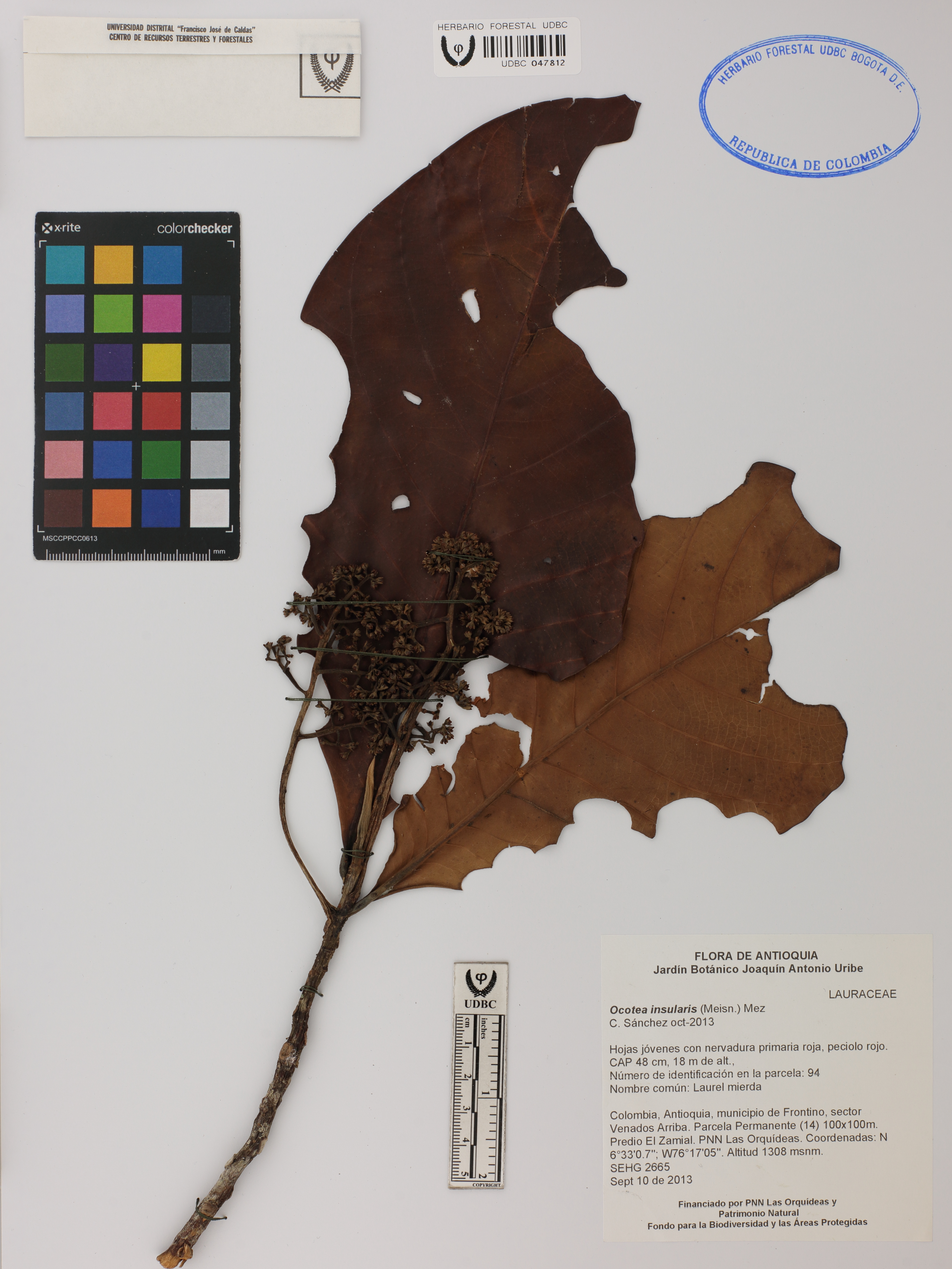 Fotografía del ejemplar Hoyos-Gómez, S. 2665, determinado como Ocotea insularis en el año 2013