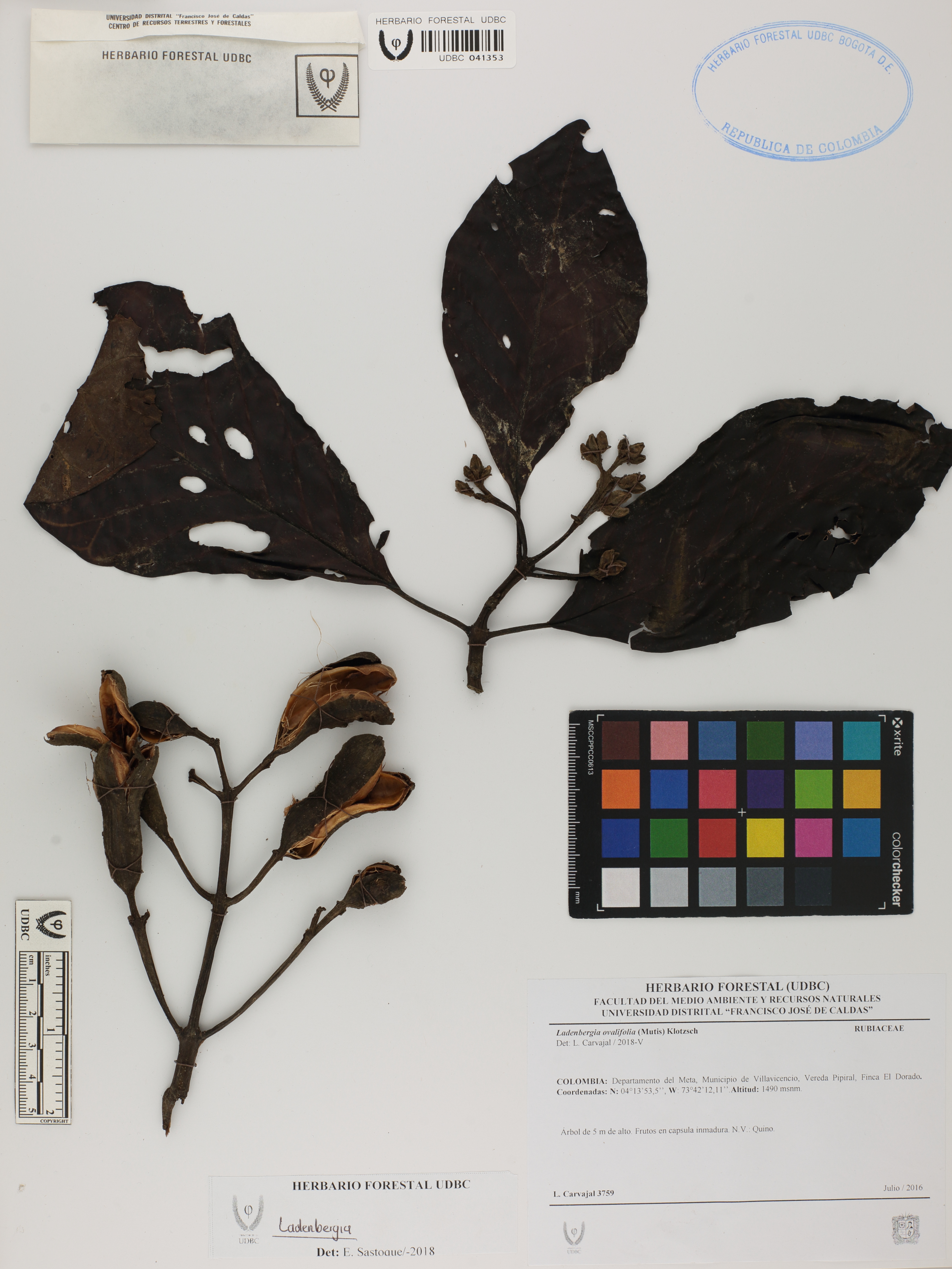 Fotografía del ejemplar Carvajal, L. 3759, determinado como Ladenbergia sp. en el año 2018