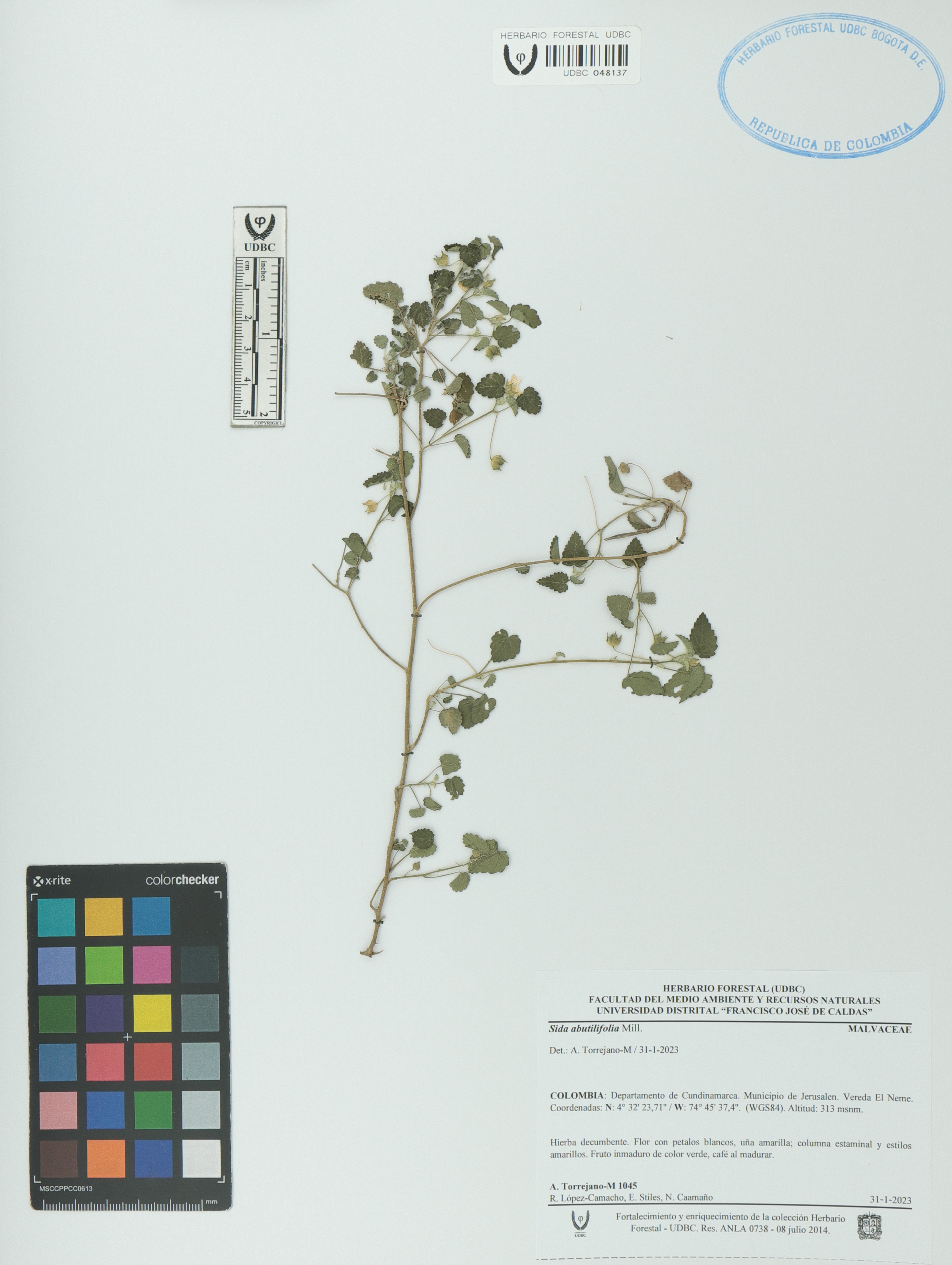 Fotografía del ejemplar Torrejano-M., A. 1045, determinado como Sida abutilifolia en el año 2023