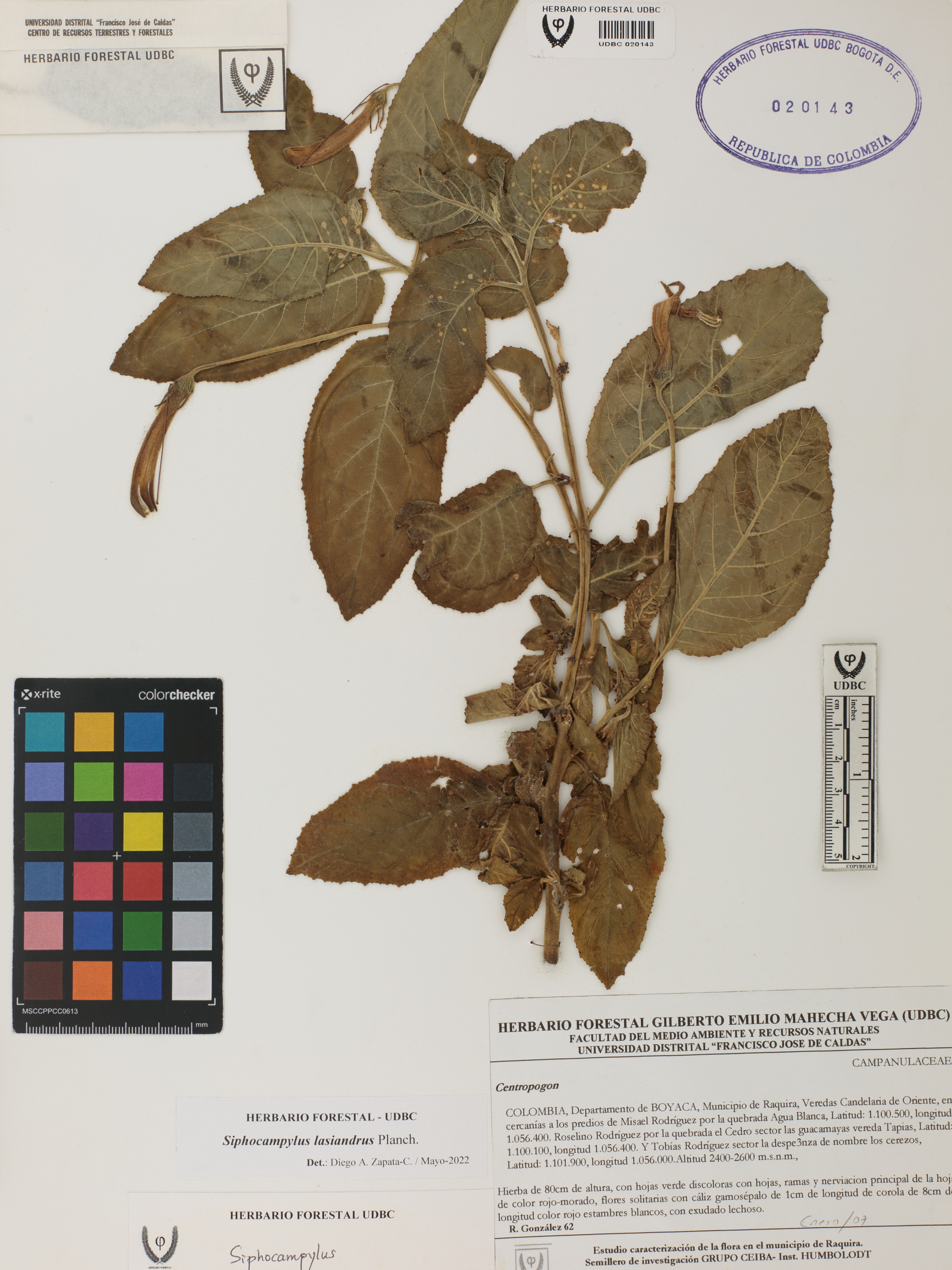 Fotografía del ejemplar González, R. 62, determinado como Siphocampylus lasiandrus en el año 2022