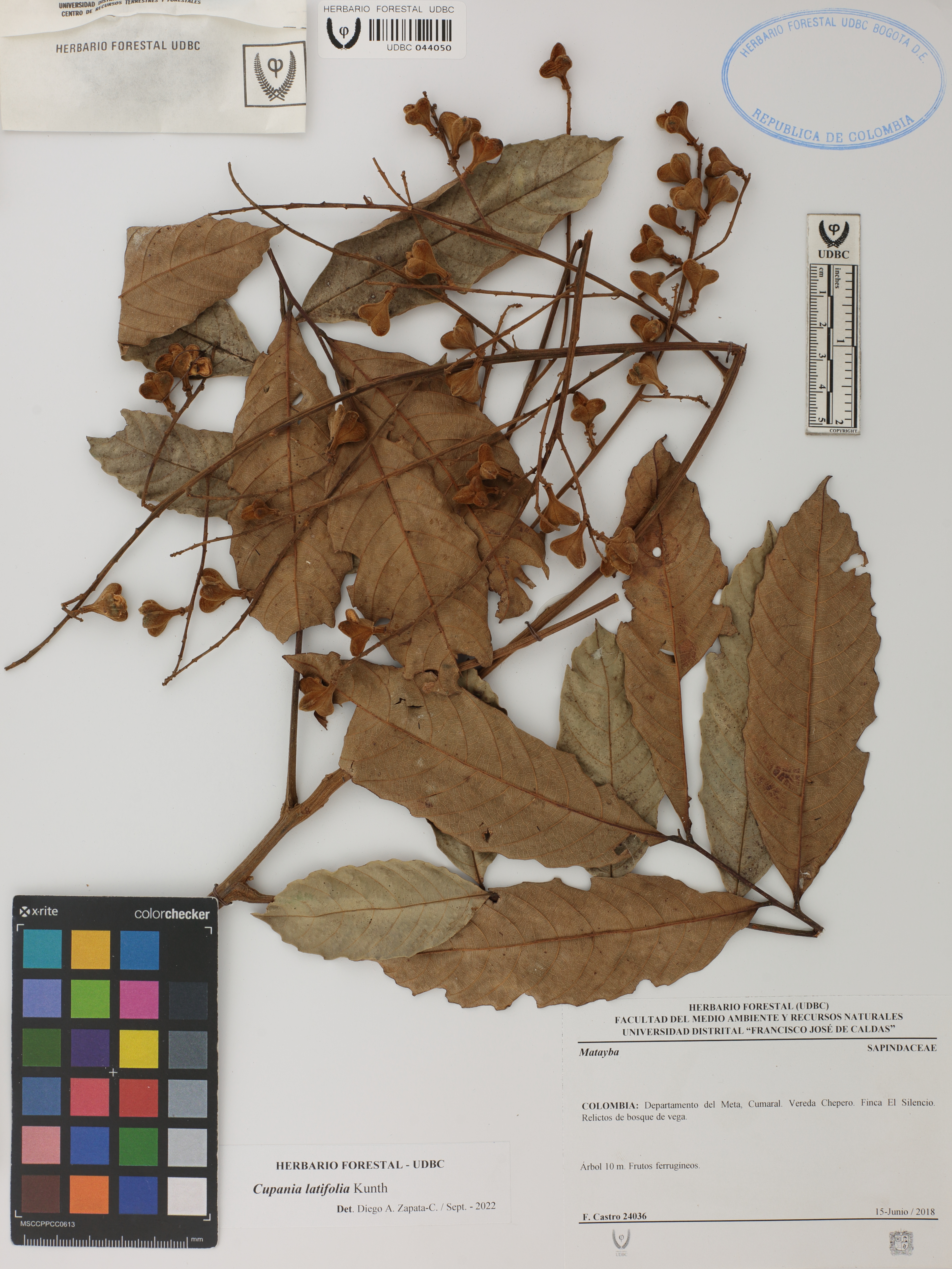 Fotografía del ejemplar Castro, F. 24036, determinado como Cupania latifolia en el año 2022
