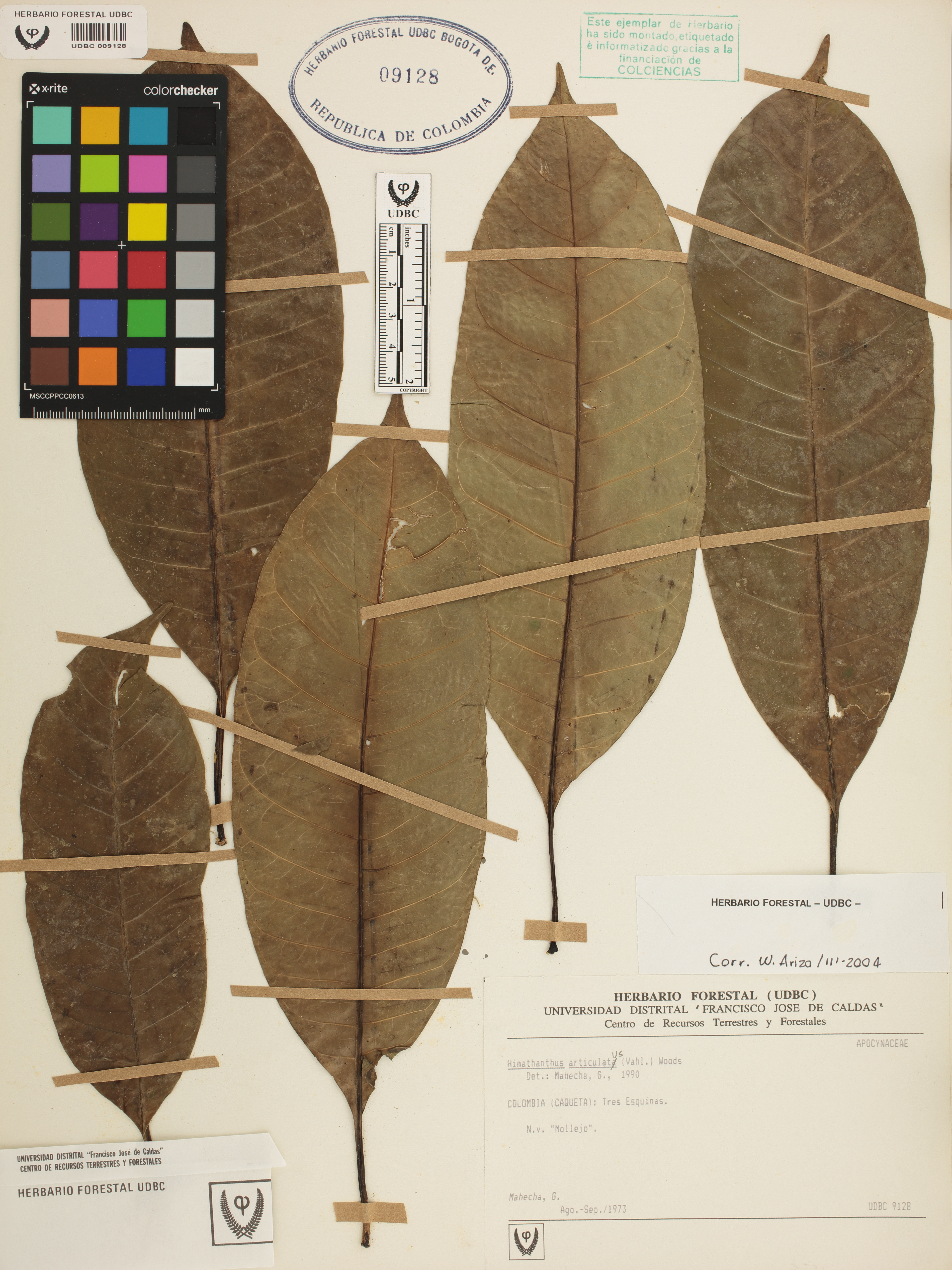 Fotografía del ejemplar Mahecha, G., determinado como Himatanthus articulatus en el año 1990