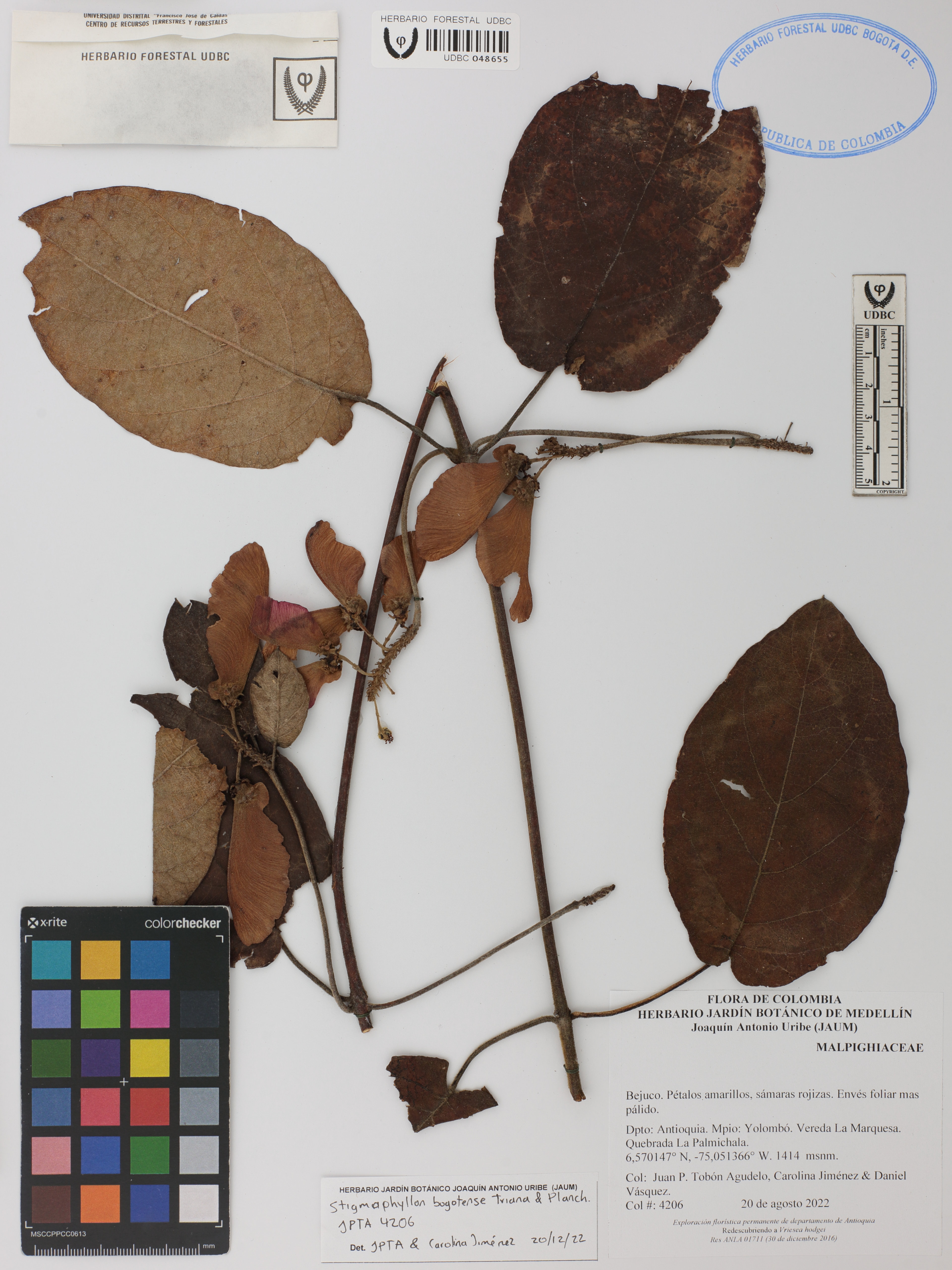 Fotografía del ejemplar Tobón-A., J. 4206, determinado como Stigmaphyllon bogotense en el año 2022