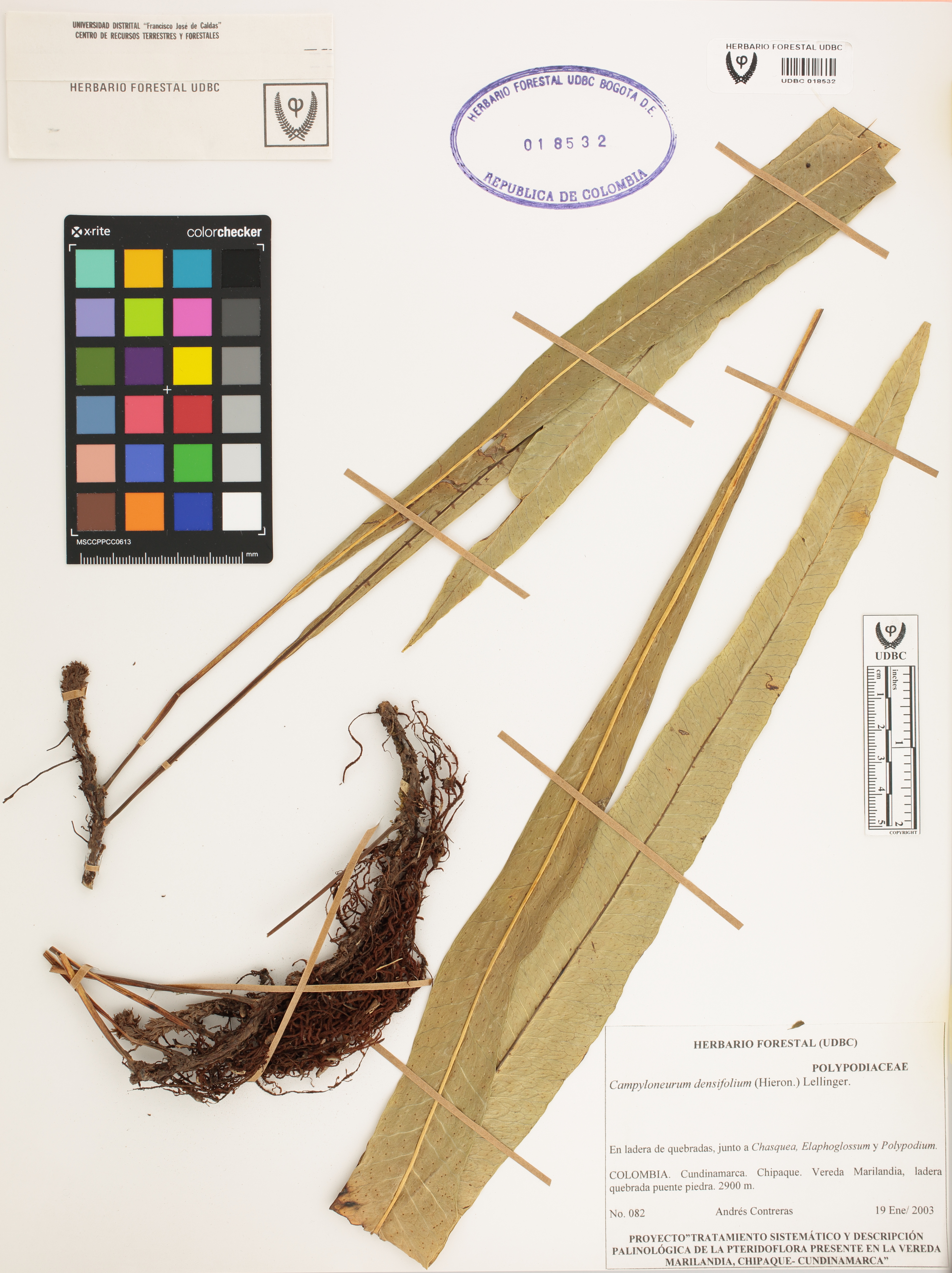 Fotografía del ejemplar Contreras, A. 82, determinado como Campyloneurum densifolium