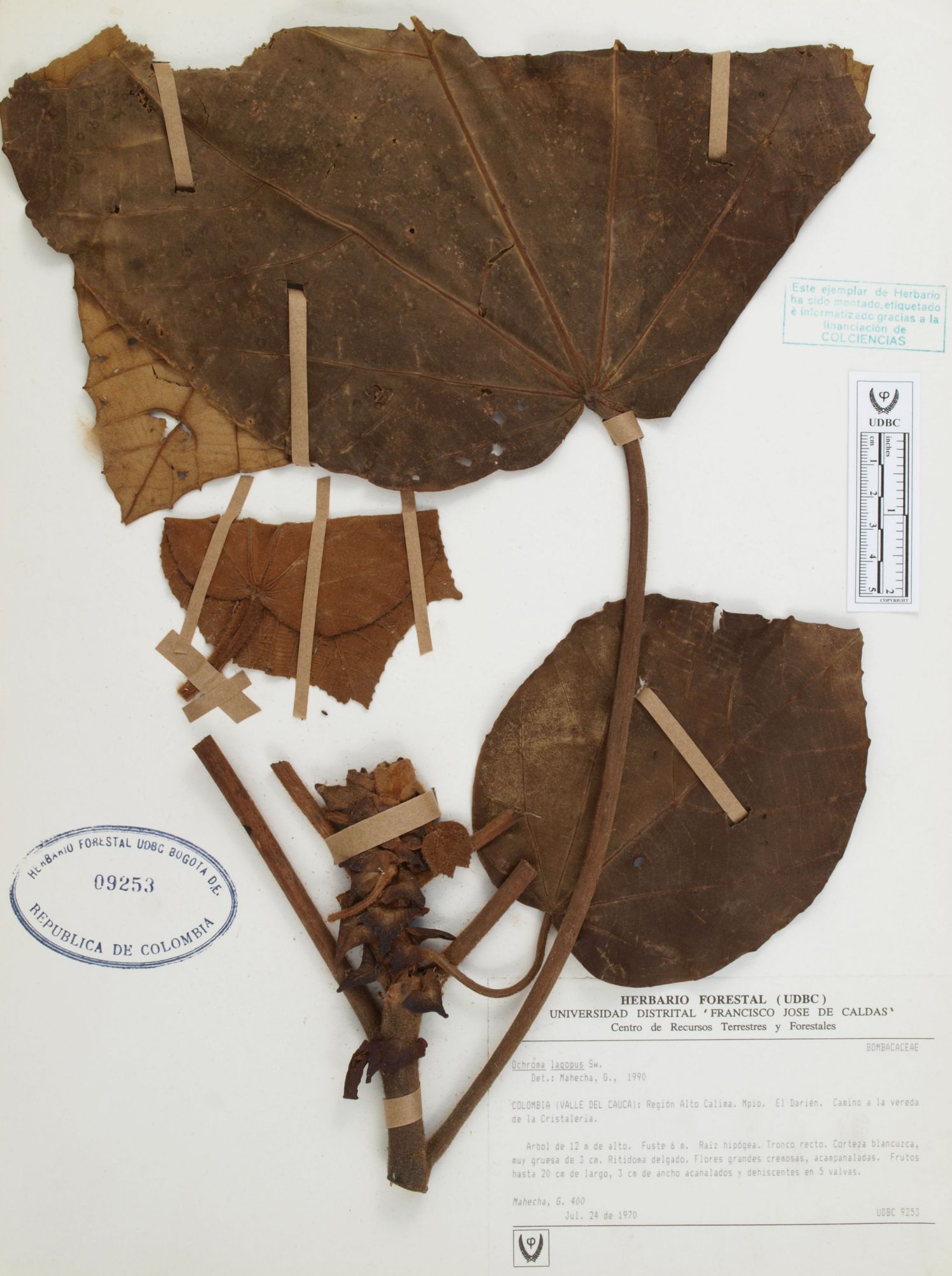 Fotografía del ejemplar Mahecha, G. 400, determinado como Ochroma pyramidale en el año 1990