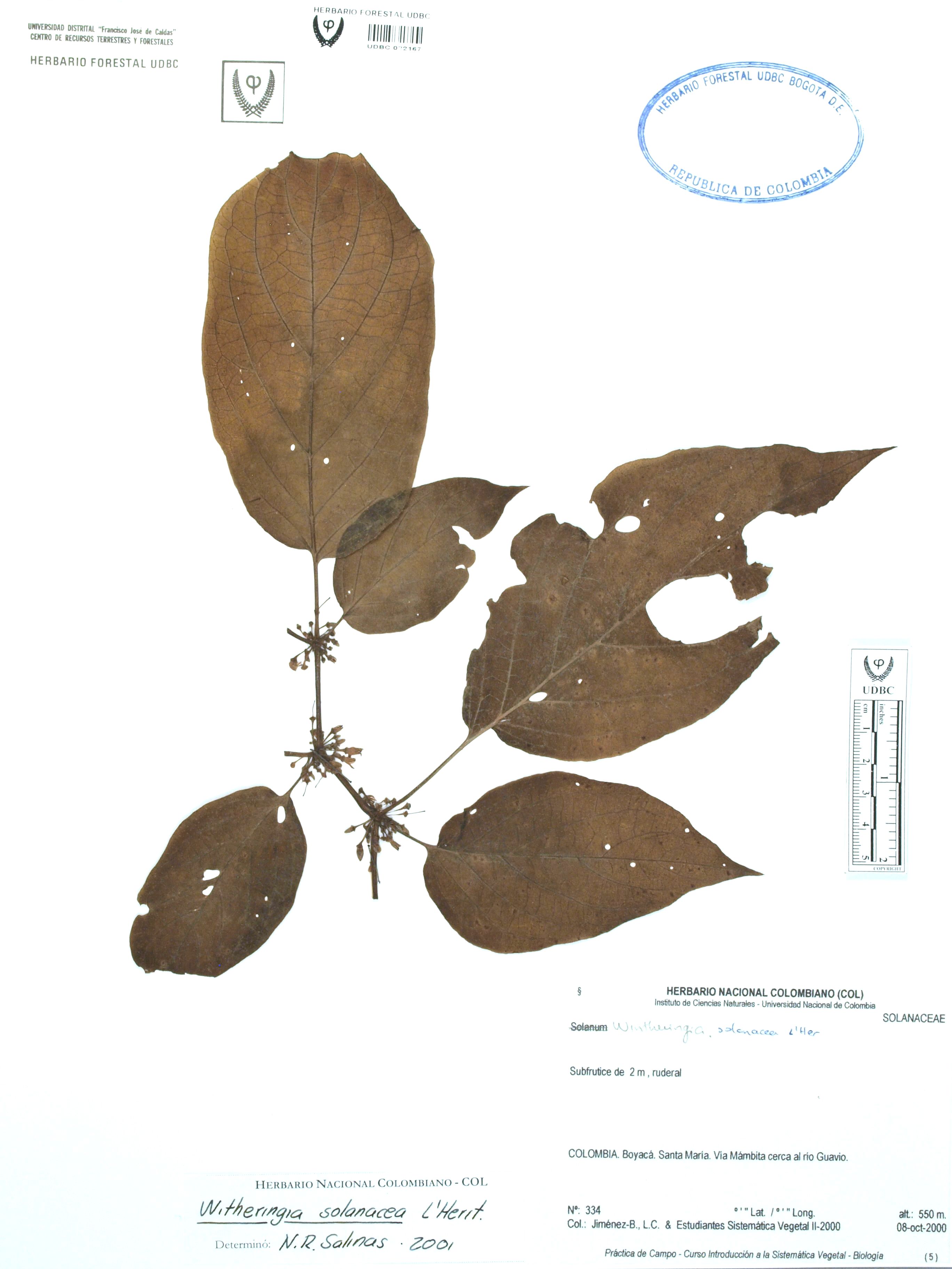 Fotografía del ejemplar Jiménez-B., L. 334, determinado como Witheringia solanacea en el año 2001