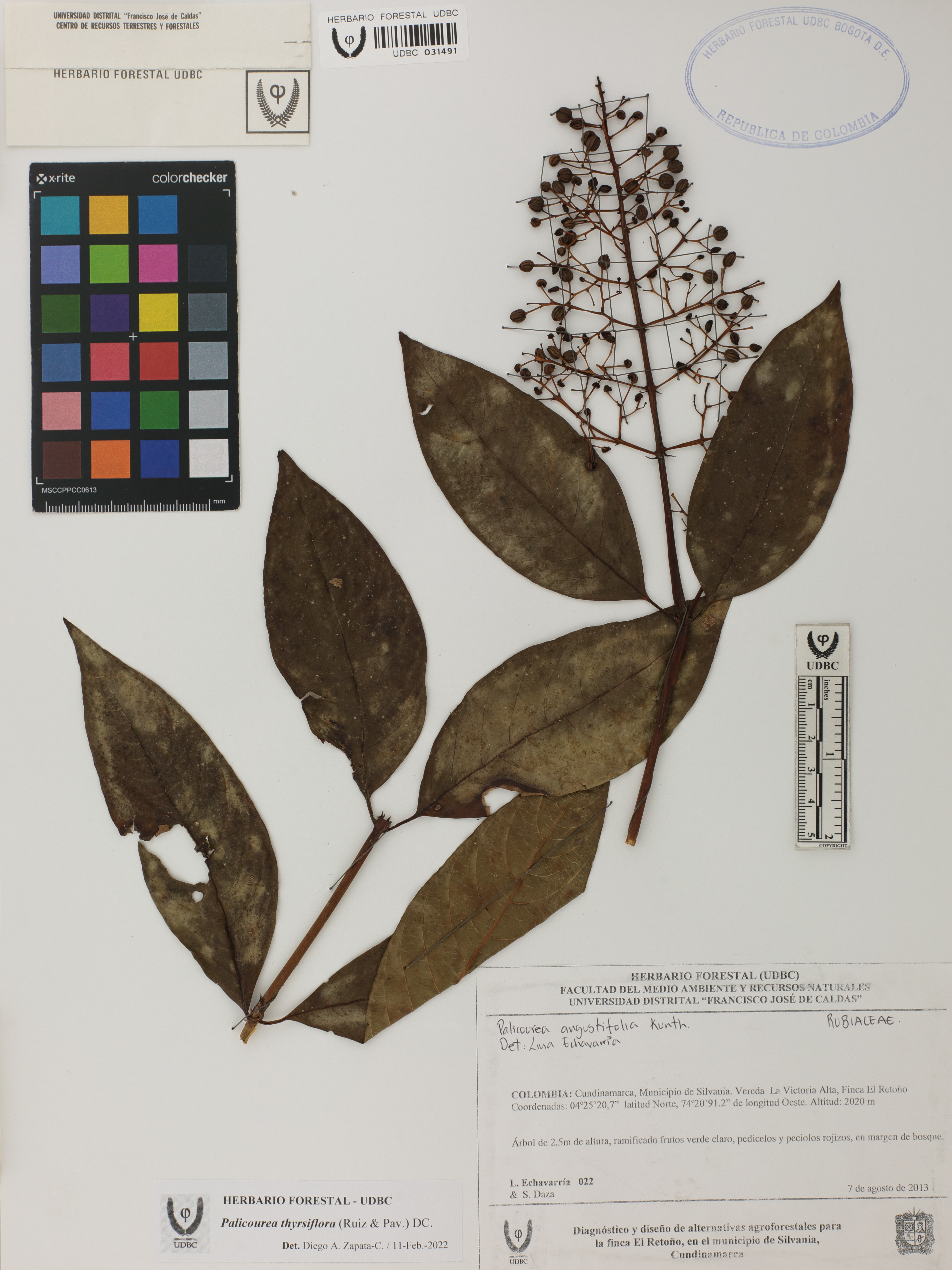 Fotografía del ejemplar Echavarría, L. 22, determinado como Palicourea thyrsiflora en el año 2022