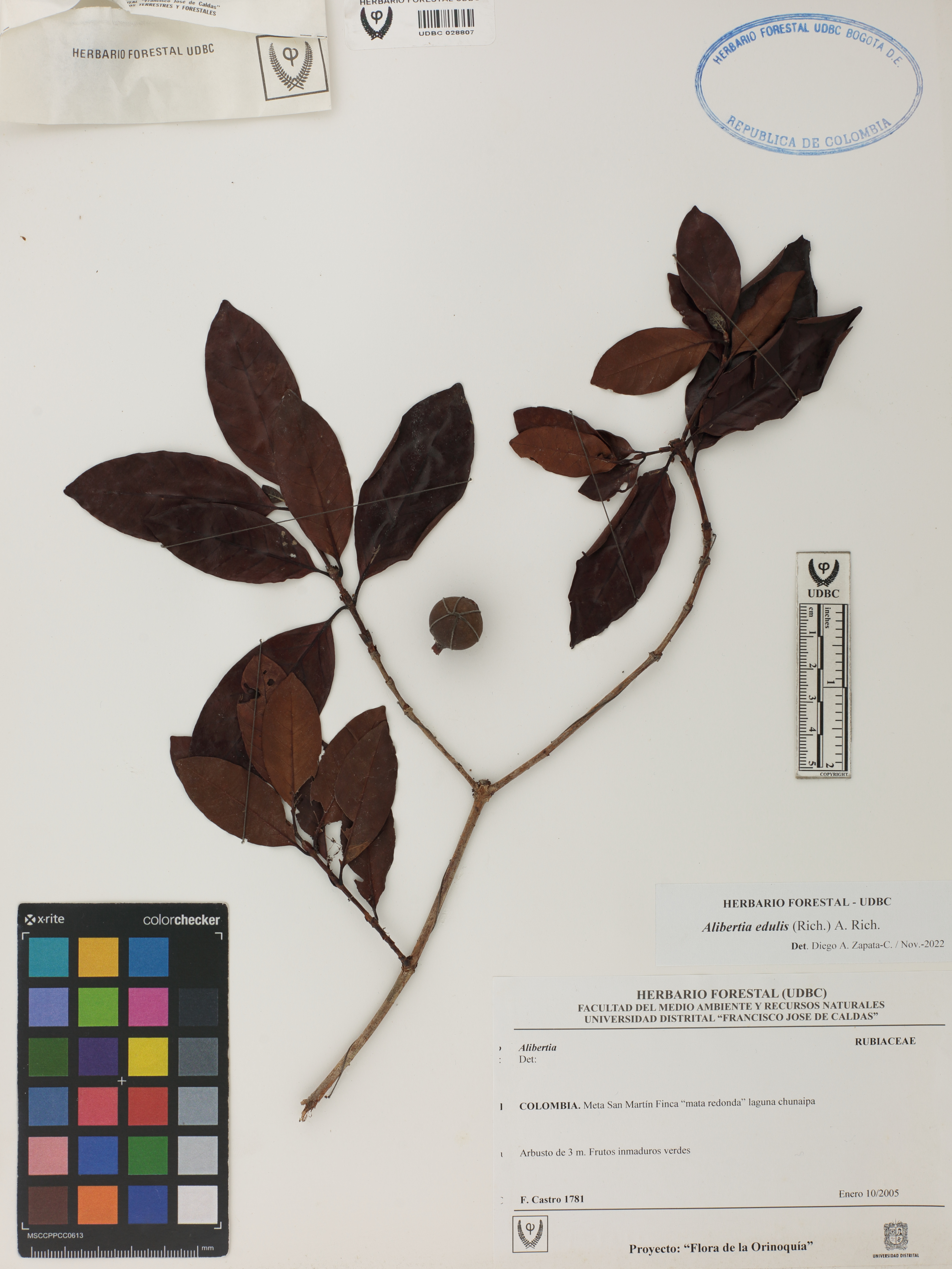 Fotografía del ejemplar Castro, F. 1781, determinado como Alibertia edulis en el año 2022