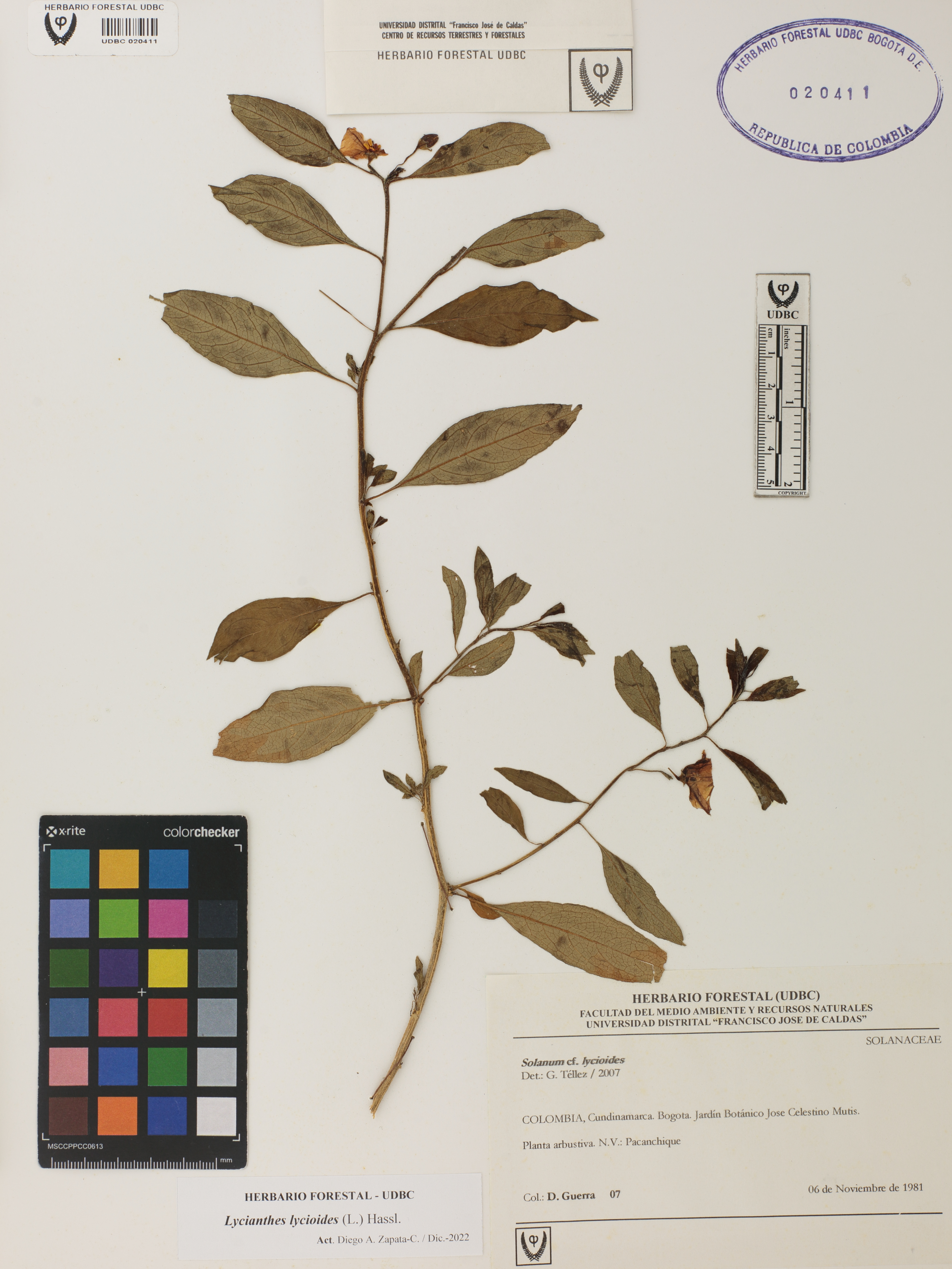 Fotografía del ejemplar Guerra, D. 7, determinado como Lycianthes lycioides en el año 2007