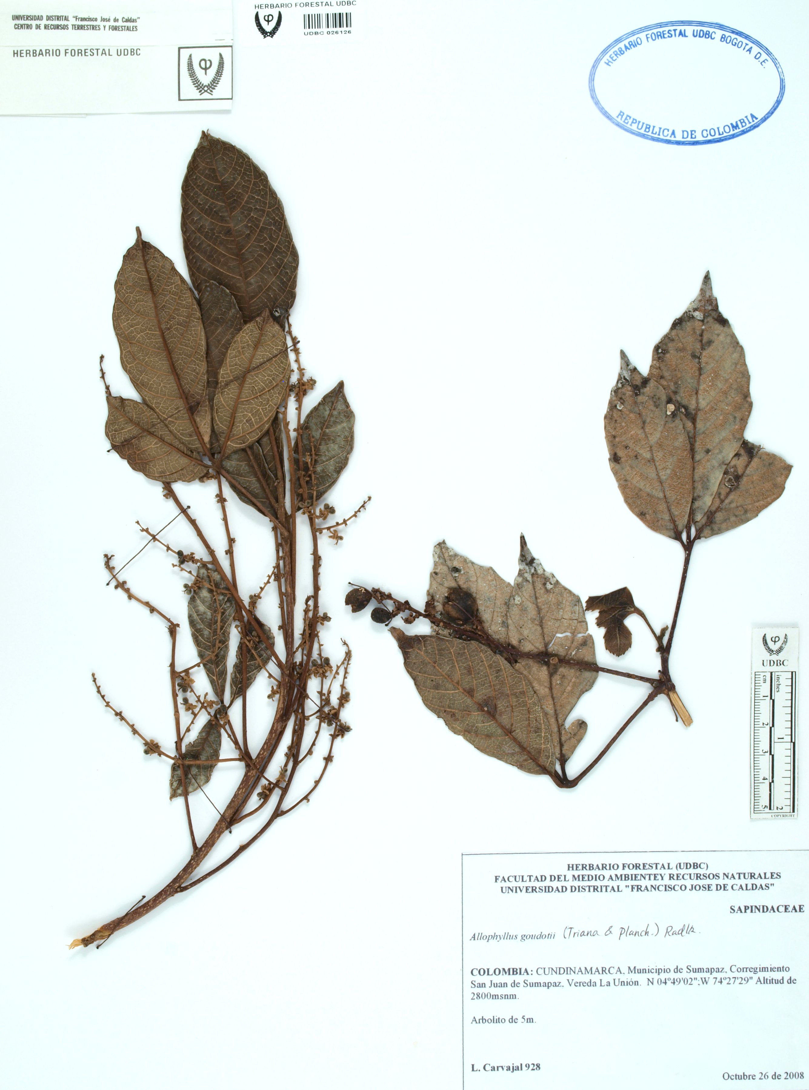 Fotografía del ejemplar Carvajal, L. 928, determinado como Allophylus goudotii