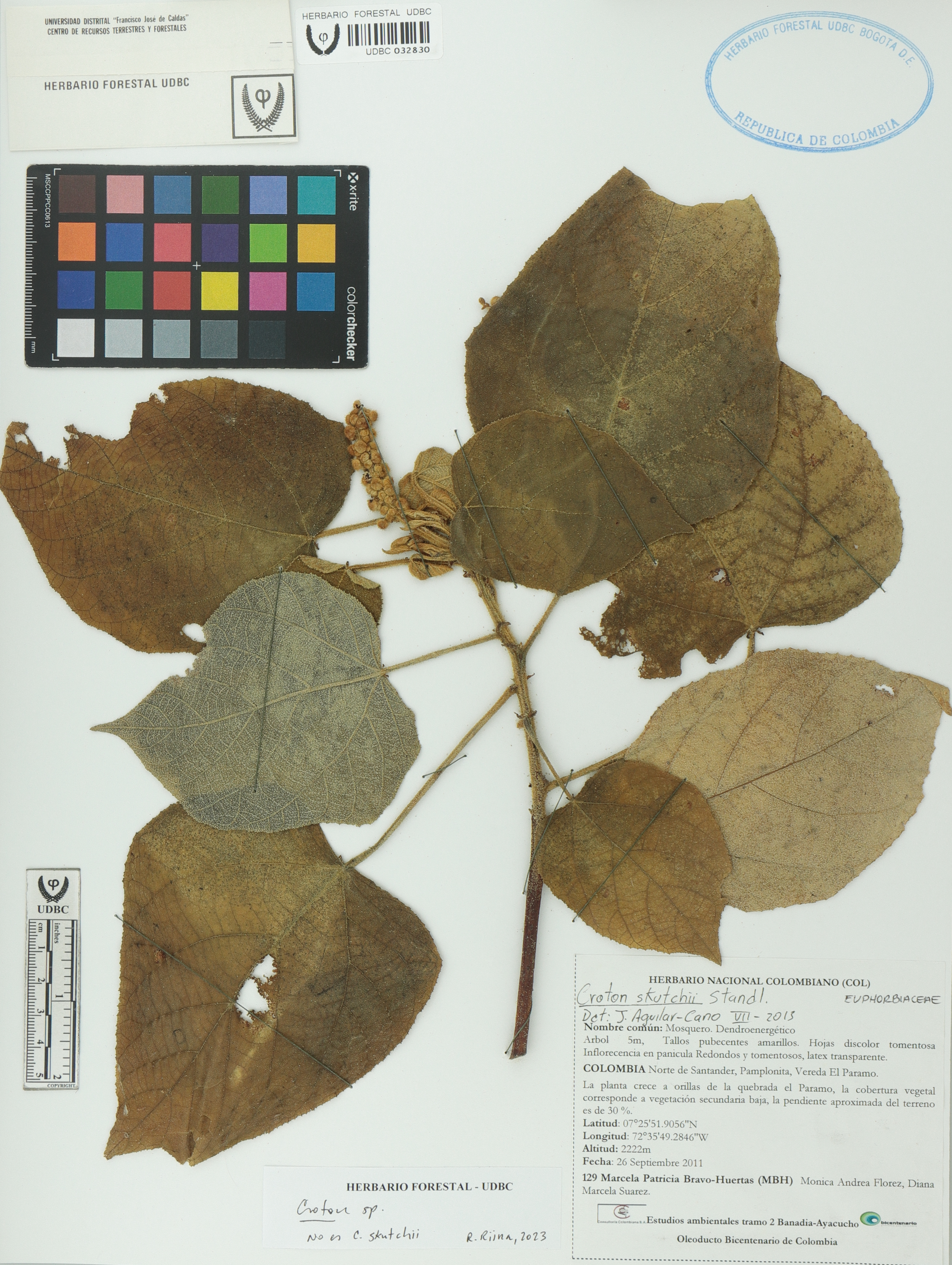 Fotografía del ejemplar Bravo-Huertas, M. 129, determinado como Croton sp. en el año 2023