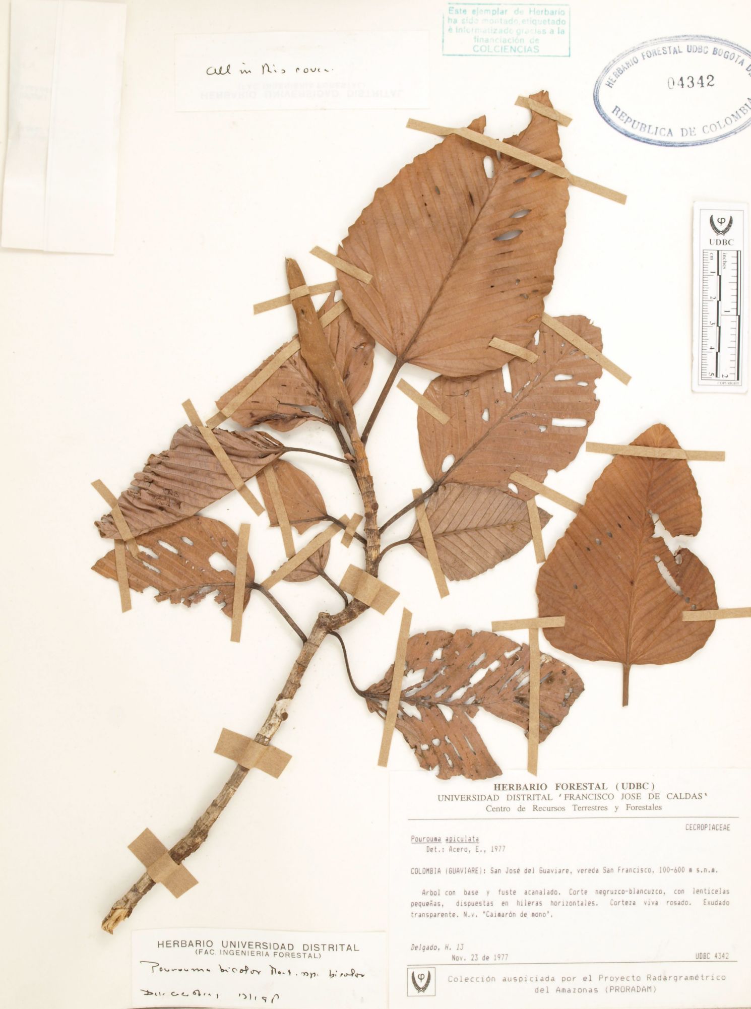 Fotografía del ejemplar Delgado, H. 13, determinado como Pourouma bicolor subsp. bicolor en el año 1997