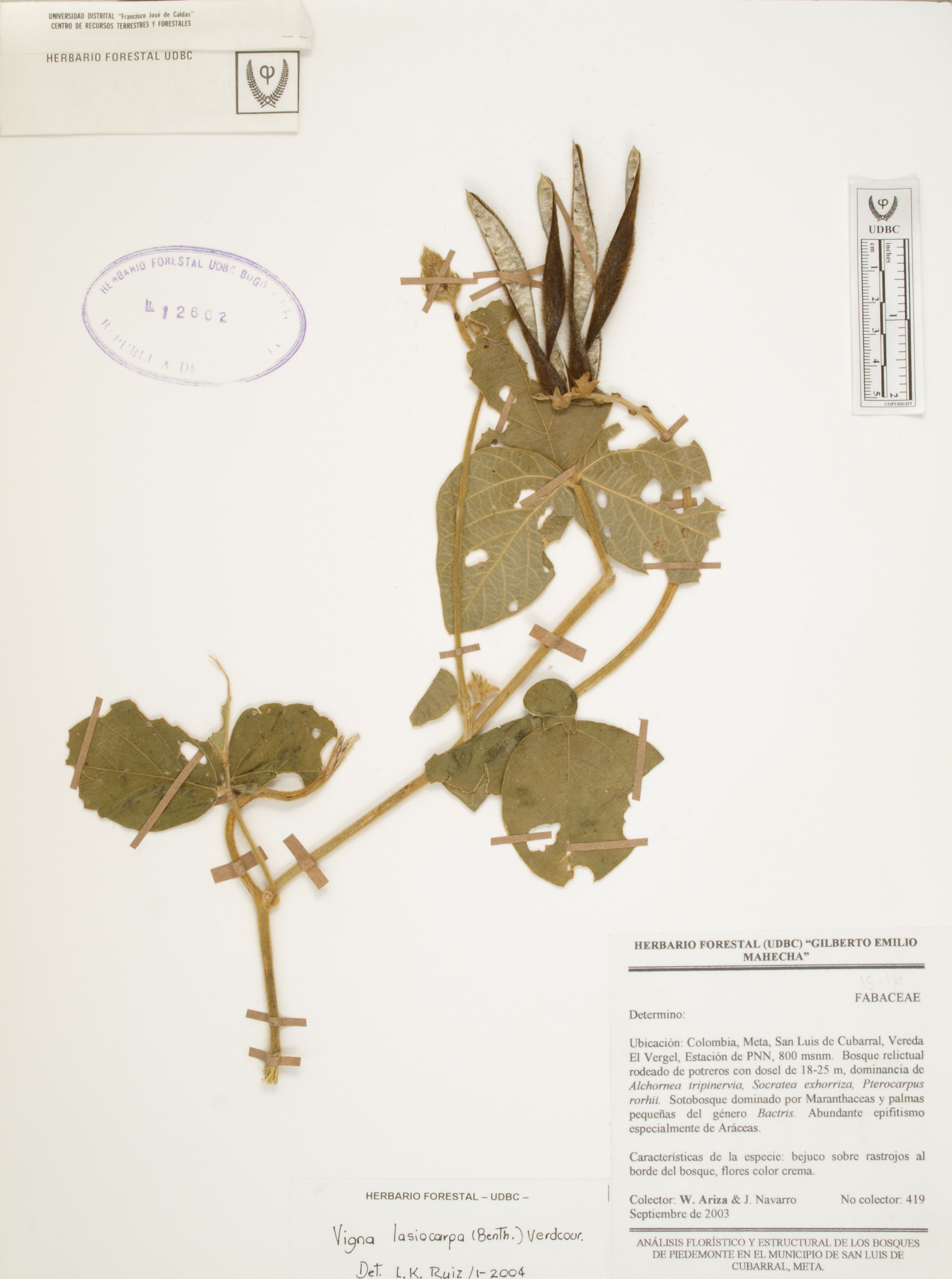 Fotografía del ejemplar Ariza, W. 419, determinado como Vigna linearis en el año 2004