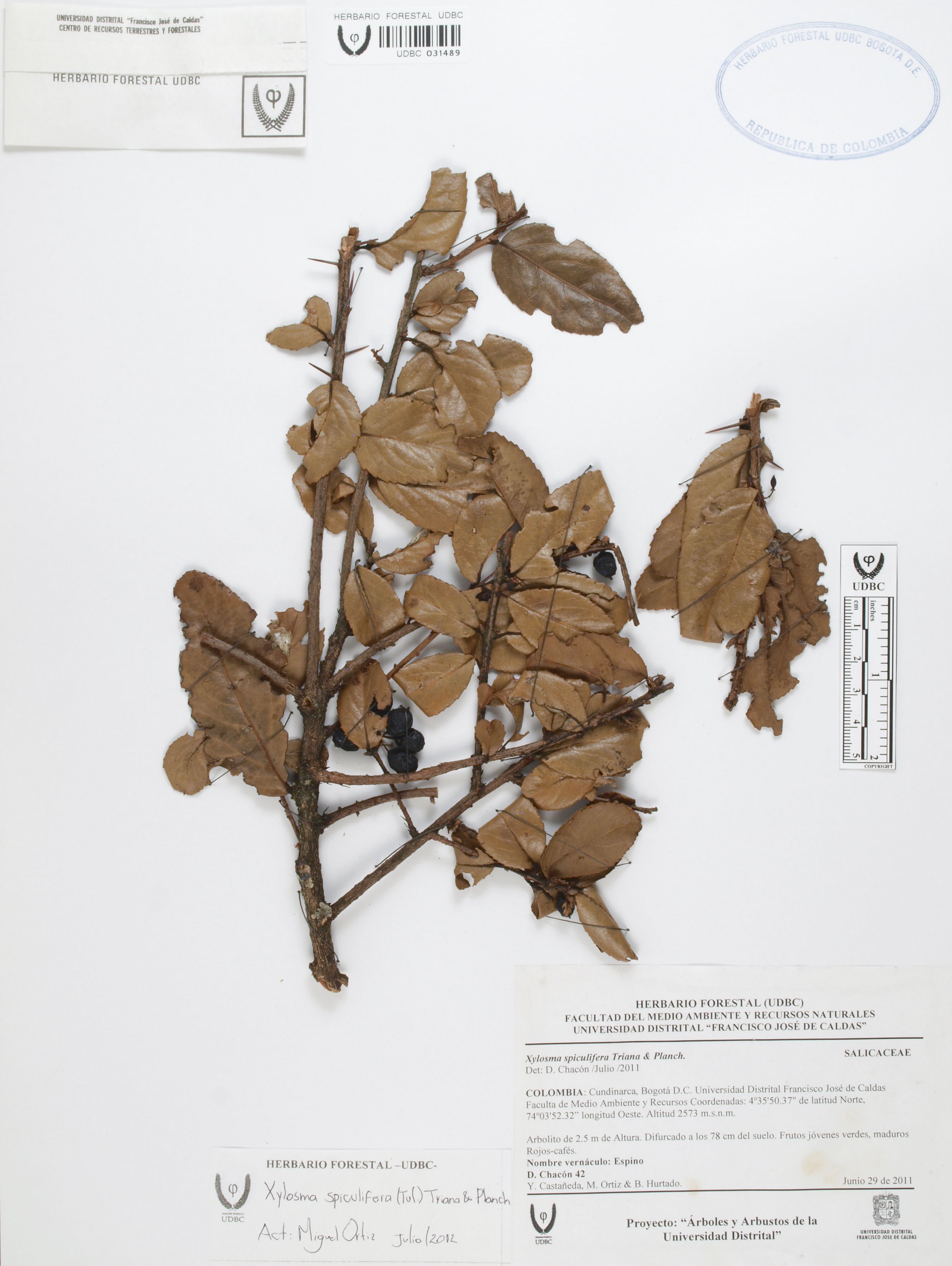 Fotografía del ejemplar Chacón, D. 42, determinado como Xylosma spiculifera en el año 2012