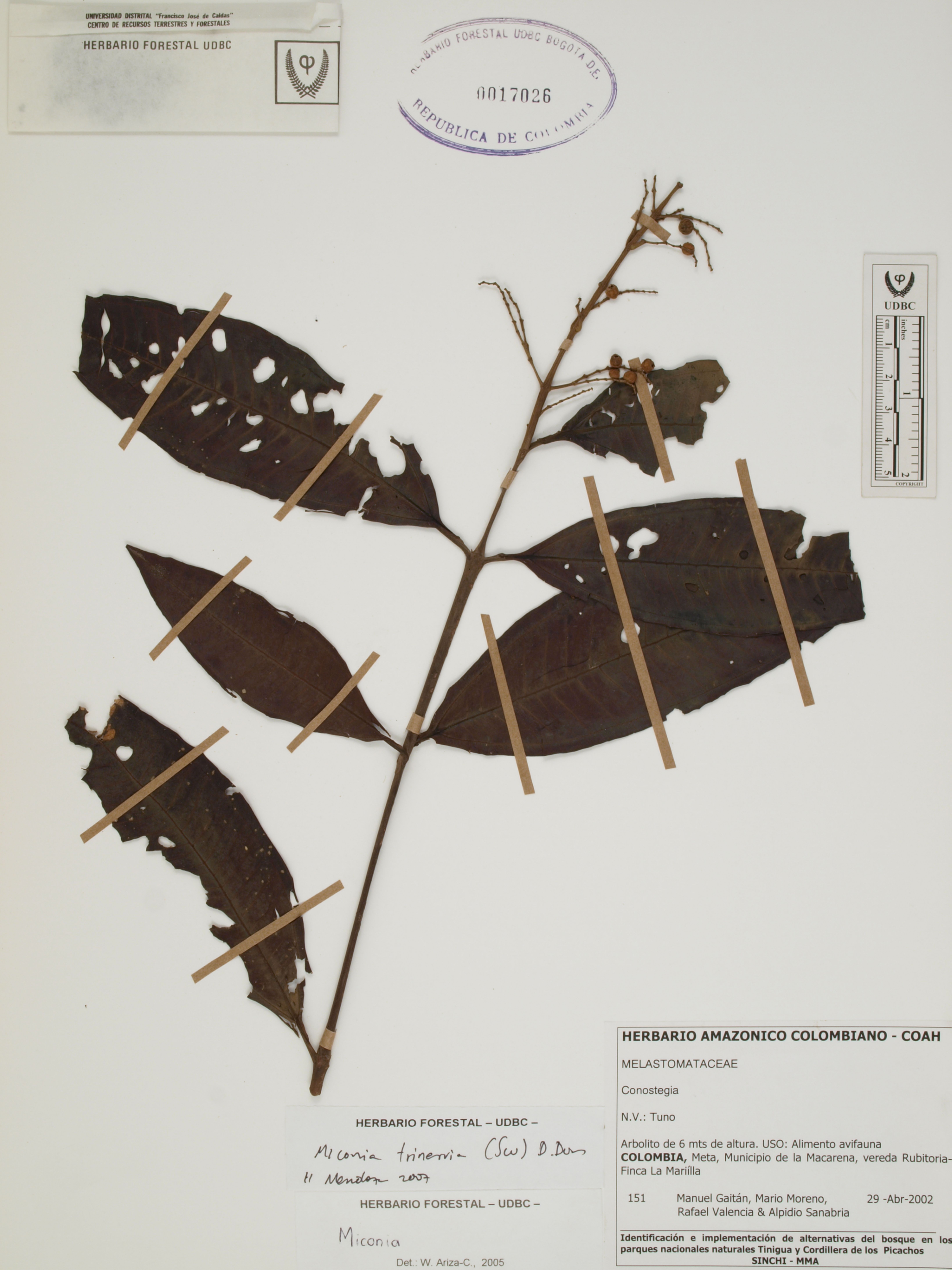 Fotografía del ejemplar Gaitán, M. 151, determinado como Miconia trinervia en el año 2007