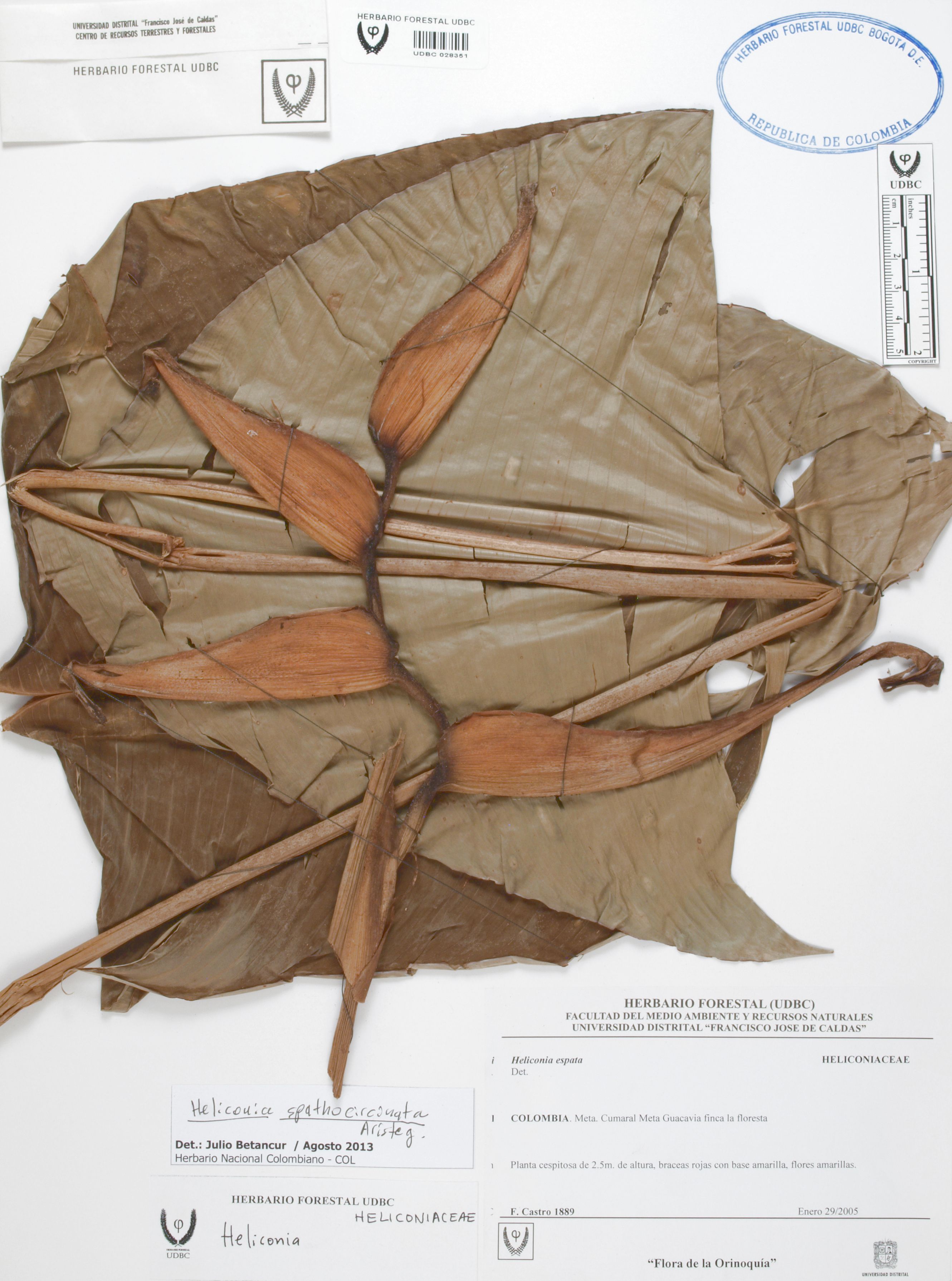Fotografía del ejemplar Castro, F. 1889, determinado como Heliconia spathocircinata en el año 2013
