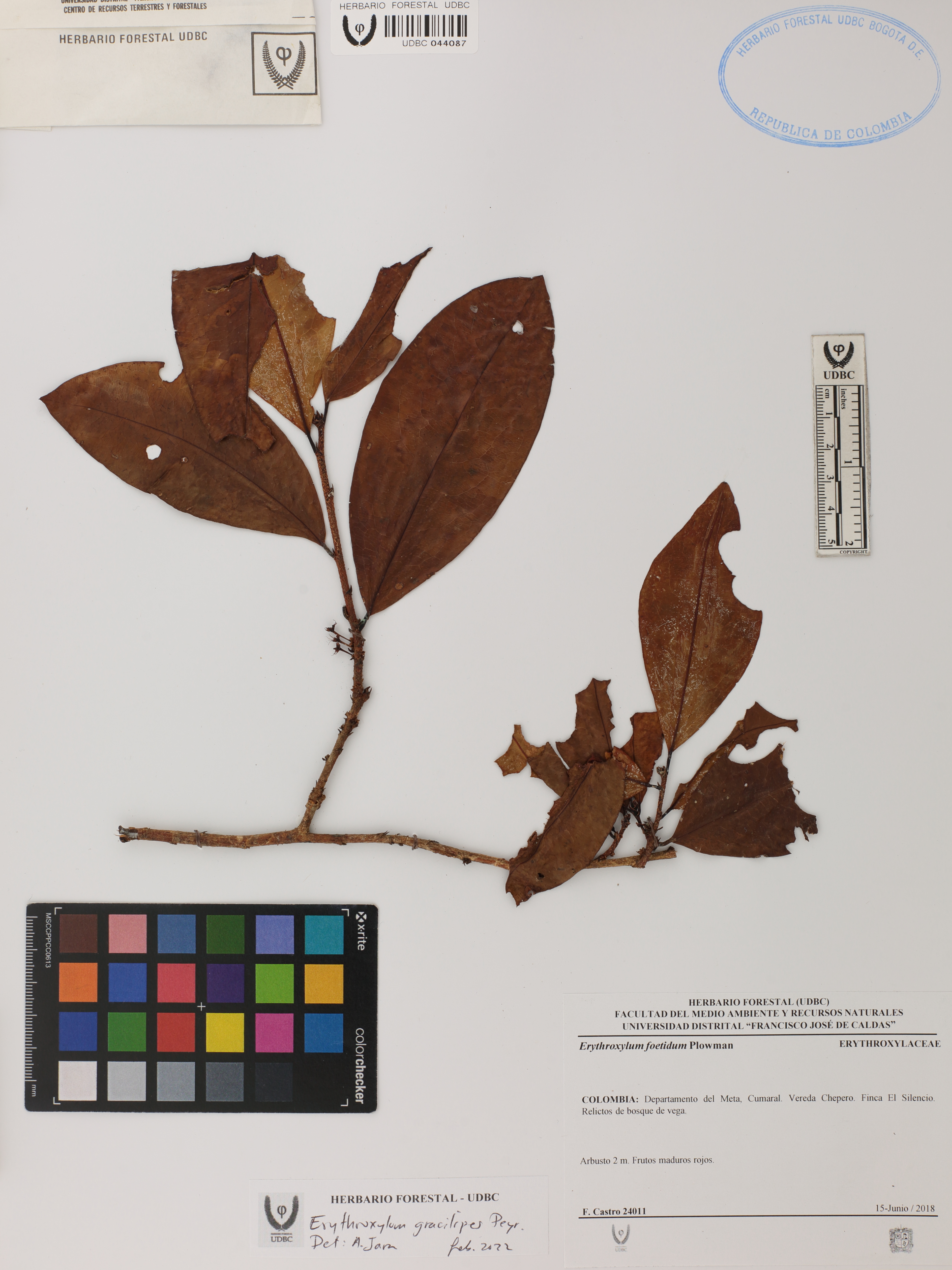 Fotografía del ejemplar Castro, F. 24011, determinado como Erythroxylum gracilipes en el año 2022