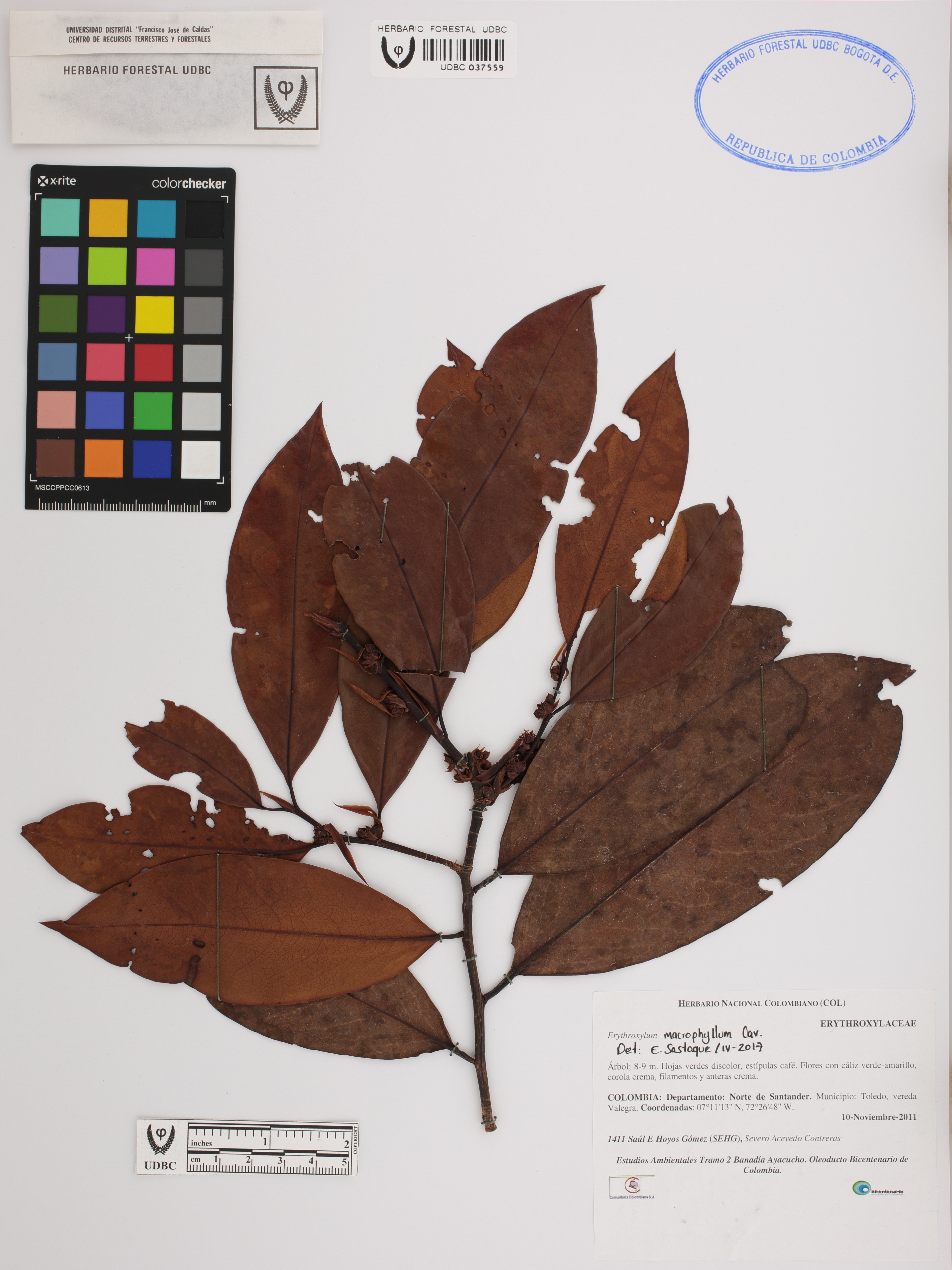 Fotografía del ejemplar Hoyos, S. 1411, determinado como Erythroxylum macrophyllum en el año 2017