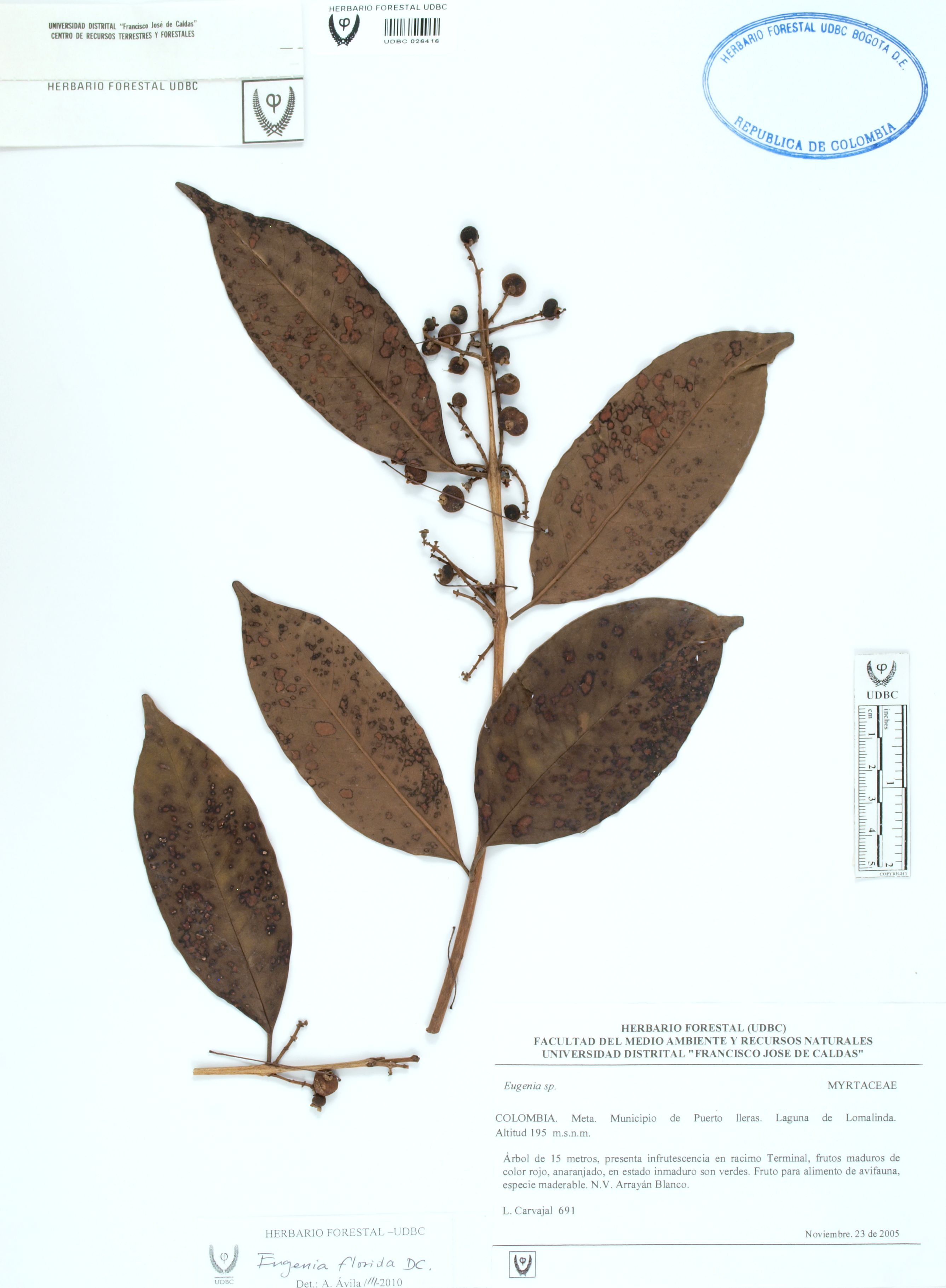 Fotografía del ejemplar Carvajal, L. 691, determinado como Eugenia florida en el año 2010