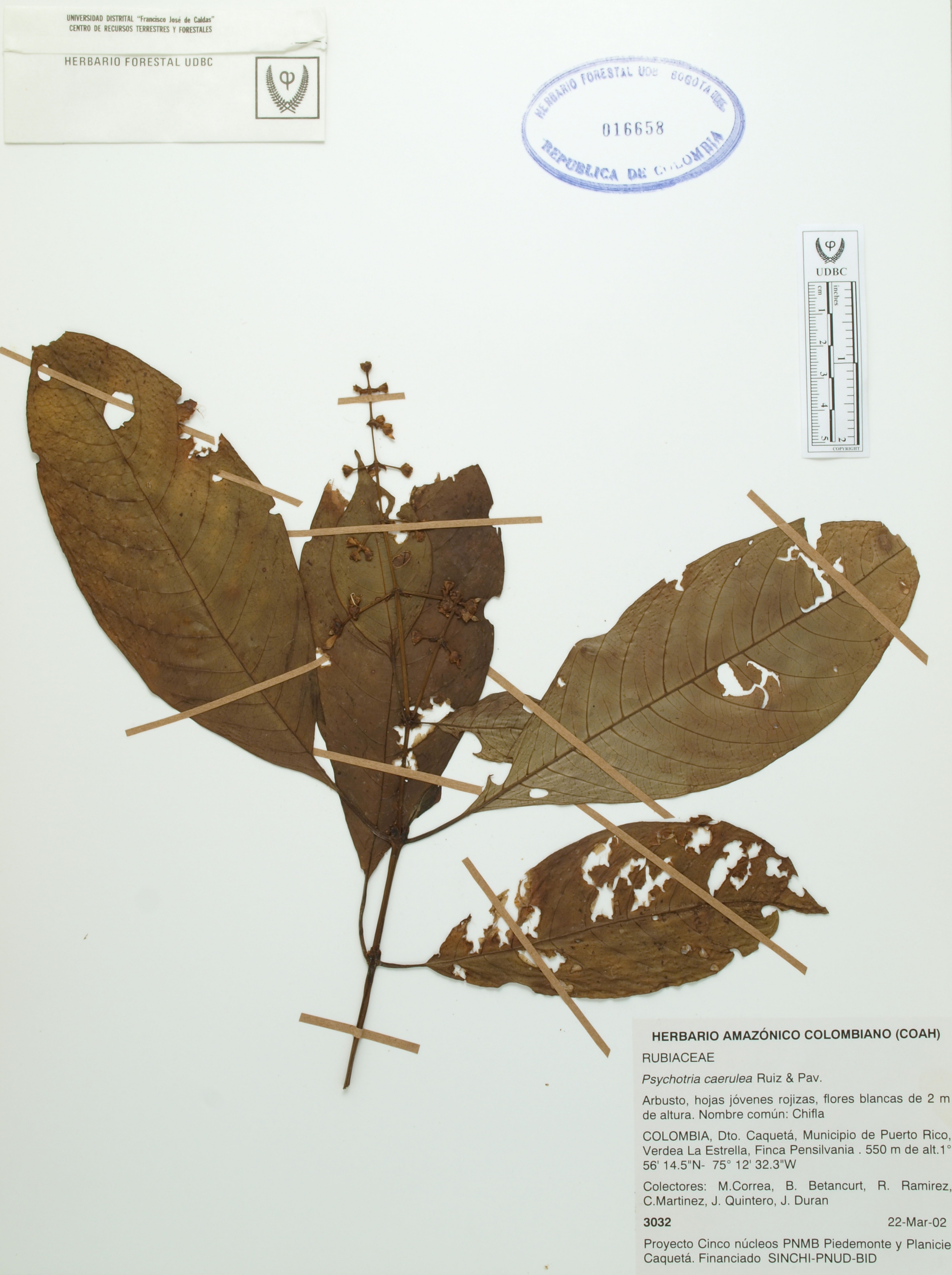 Fotografía del ejemplar Correa, M. 3032, determinado como Palicourea caerulea en el año 2024